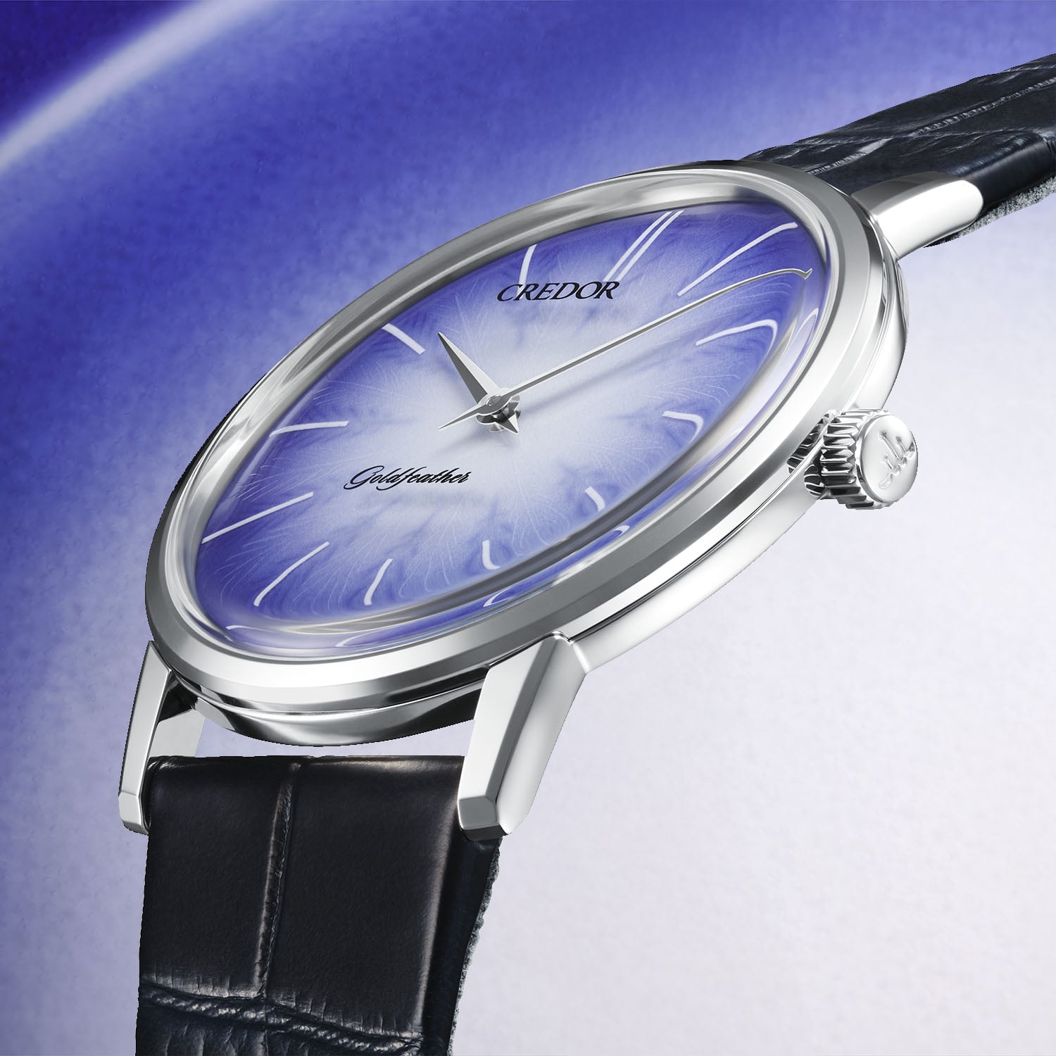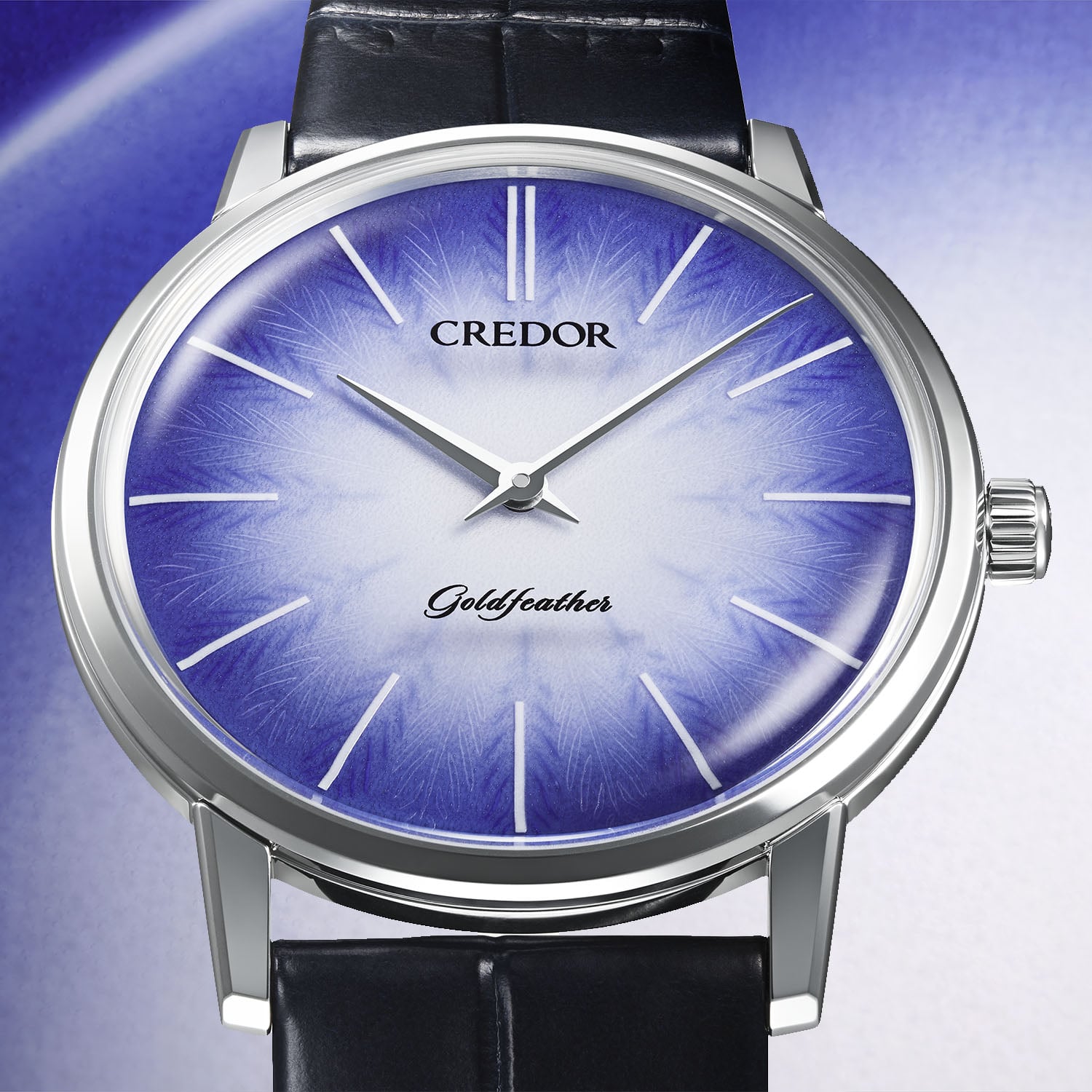 The first Goldfeather model was the result of Seiko’s pursuit of thin mechanical calibres and appeared in 1960. Powered by the 2.95mm calibre 60 that was the world’s thinnest 3-hand mechanical movement at that time, only to be outdone by its 1969 successor, calibre 6800 with an ultra-slim height of just 1.98mm, this family of ultra-thin movements would become the foundation stone of the Credor brand in 1974. Reborn as a collection in 2023, the Goldfeather stands out with its stunning handcrafted dials.
