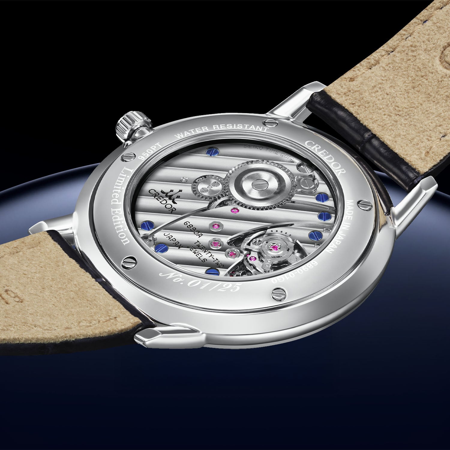 A colour rarely seen in urushi lacquer work, the rich blue dial features a gradient effect, with almost black tones on the periphery and a more luminous blue in the centre. Created by Credor’s artisans using the ancient art of urushi lacquer, the sticky resin eventually creates a hard, waterproof and silky surface when it dries. To achieve the gradient effect, artisans apply layer after layer of lacquer with varying pigment saturation, leaving each layer to dry. The glossy uniform surface is achieved with whetstone polishing.