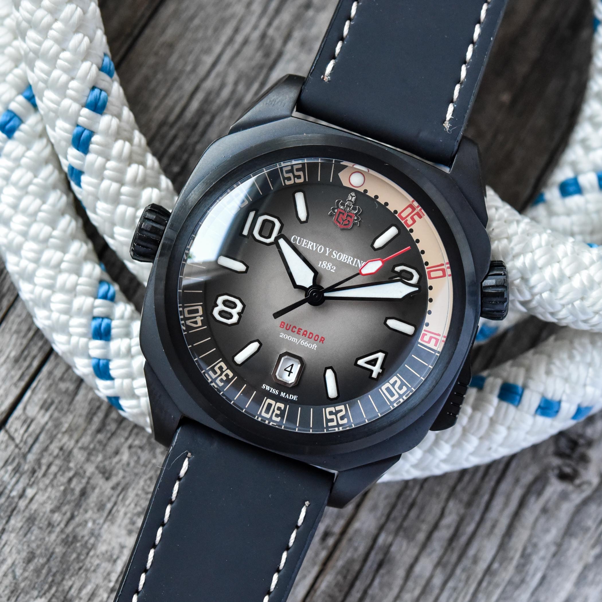 - Buceador Caribe Coral Negro: the more modern version of the three, with a black DLC-coated stainless steel case, a black/grey gradient dial with a smoked effect, touches of red on the dive bezel, the seconds hand and the Buceador inscription, a matte black rubber strap with a red lining and a second black high gloss leather strap