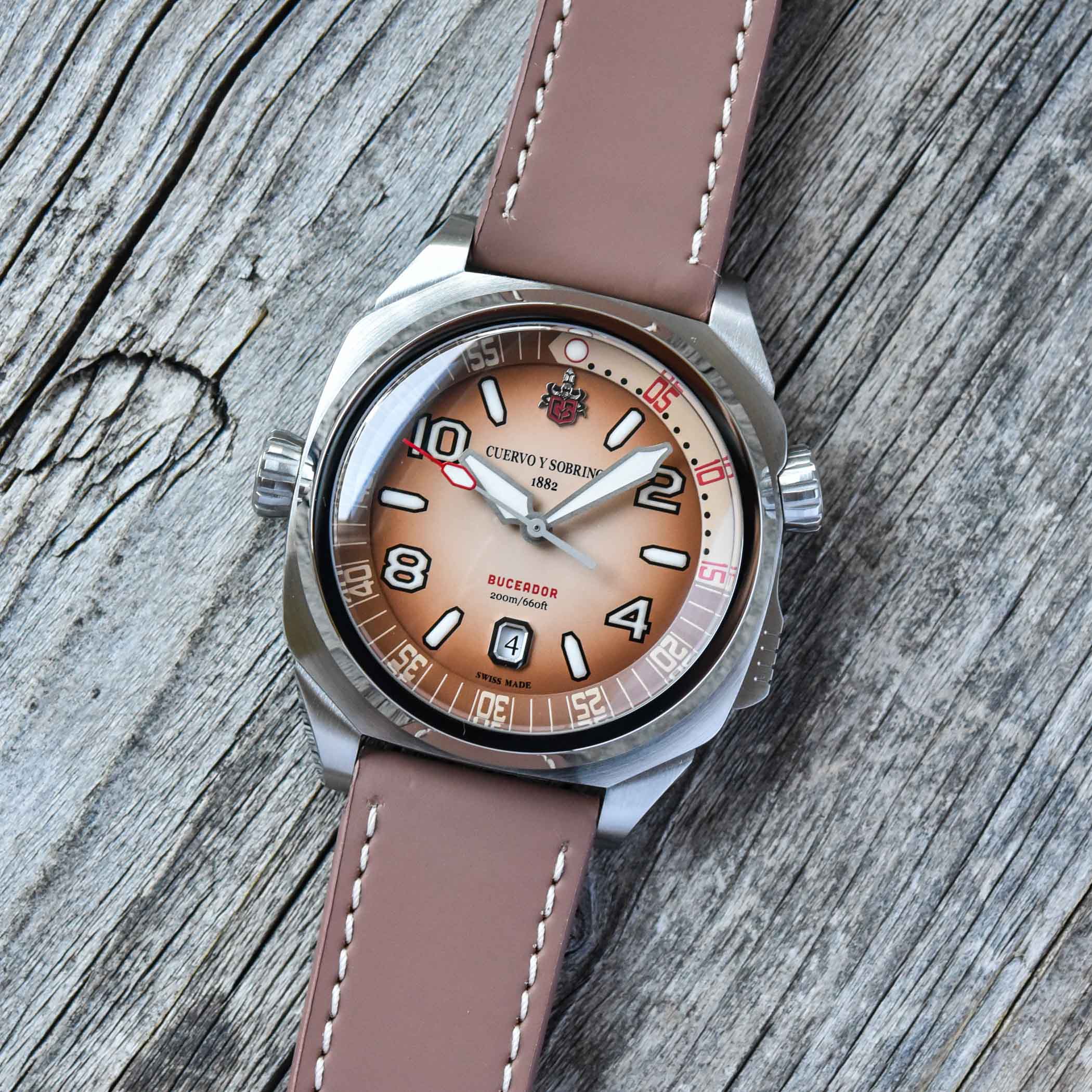 - Buceador Caribe Cayo Coco: a more “land” styled watch, with a stainless steel case, a gradient light brown, sand-coloured dial, a dive bezel highlighted with red numerals to match the tip of the central seconds hand, markers outlined in black and printed with white Super-LumiNova, a matte brown rubber strap with a red lining and an additional light brown high gloss leather strap