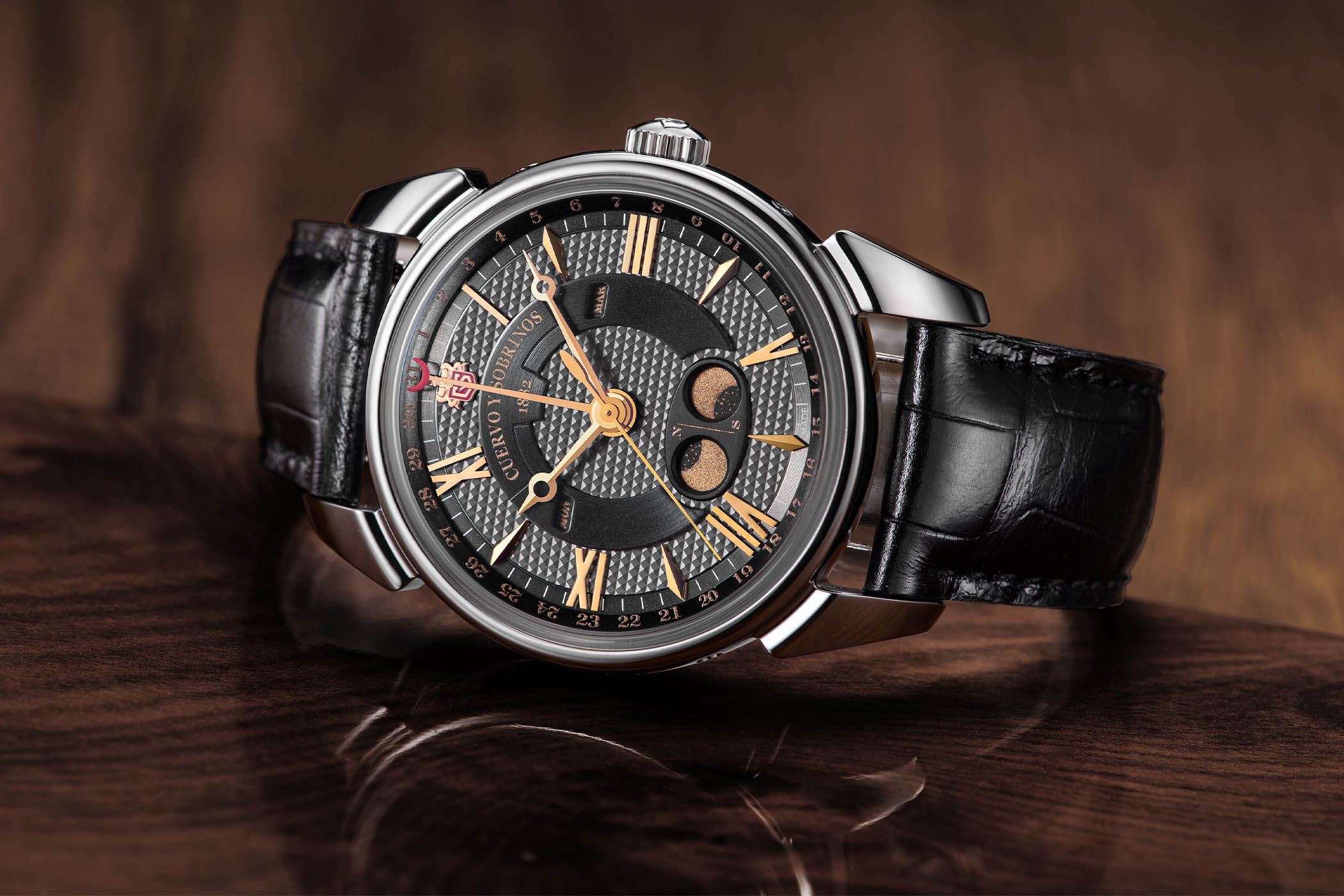 The Cuervo y Sobrinos Historiador Doble Luna comes with a matte black Louisiana alligator strap and stainless steel folding buckle with the brand’s coat of arms. It is not a limited edition and retails for CHF 5,500.