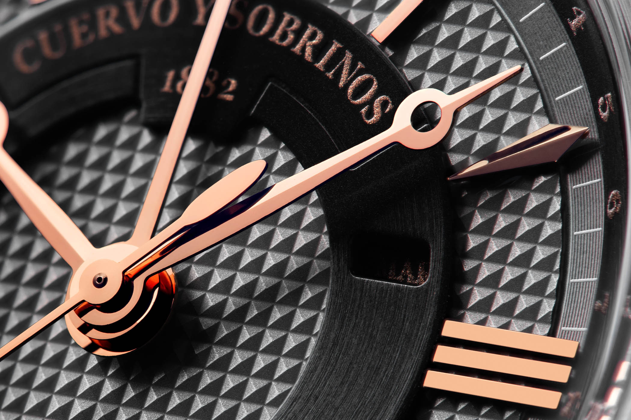 The flamboyance of the dial is achieved with an anthracite Clous de Paris guilloché-style (stamped) background and golden details. Peripheral gilt powder date numerals from 1-31 are indicated by a red-crescent shaped pointer. Adjacent to the date is a second ring with a snailed finishing and white minute/second markings leading to the Clous de Paris chapter ring. Six oversized golden Roman numerals applied at XI, I, III, V, VII and IX extend from the stamped guilloché area to the minute track and are accompanied by stylish faceted spear-shaped golden markers. At noon is the CyS coat of arms with a red interior to match the red-tipped pointer hand. A second satin-brushed ring placed above the stamped pattern on the dial features two apertures at 10 and 2 o’clock for the day of the week and the month picked out in gilt powder to match the brand name also printed on the central disc. All four hands are golden; the hour and minute hands are distinguished by their Breguet-style open tips, while the central seconds has an oblong counterweight and the date hand has a red tip.