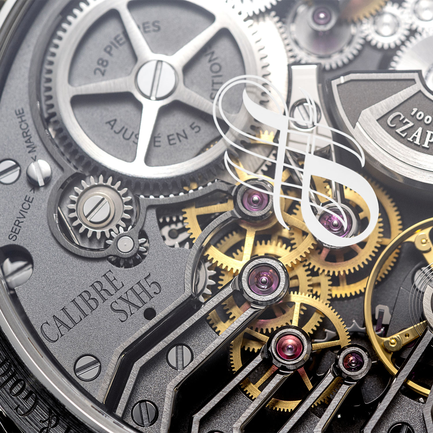 Turning the watch over reveals Czapek’s beautiful in-house automatic calibre SXH5 driven by an off-centred platinum micro-rotor. The gear train is secured by seven black sandblasted and skeletonised bridges, including the transversal bridge securing the variable inertia balance wheel. Beating at a frequency of 28,800vph, the single barrel delivers a power reserve of 60 hours. The finishing is modern but elaborate, with hand chamfering, black polishing and bevelling. The sapphire crystal on the caseback features a transfer of Sincere Watches’ commemorative logo.