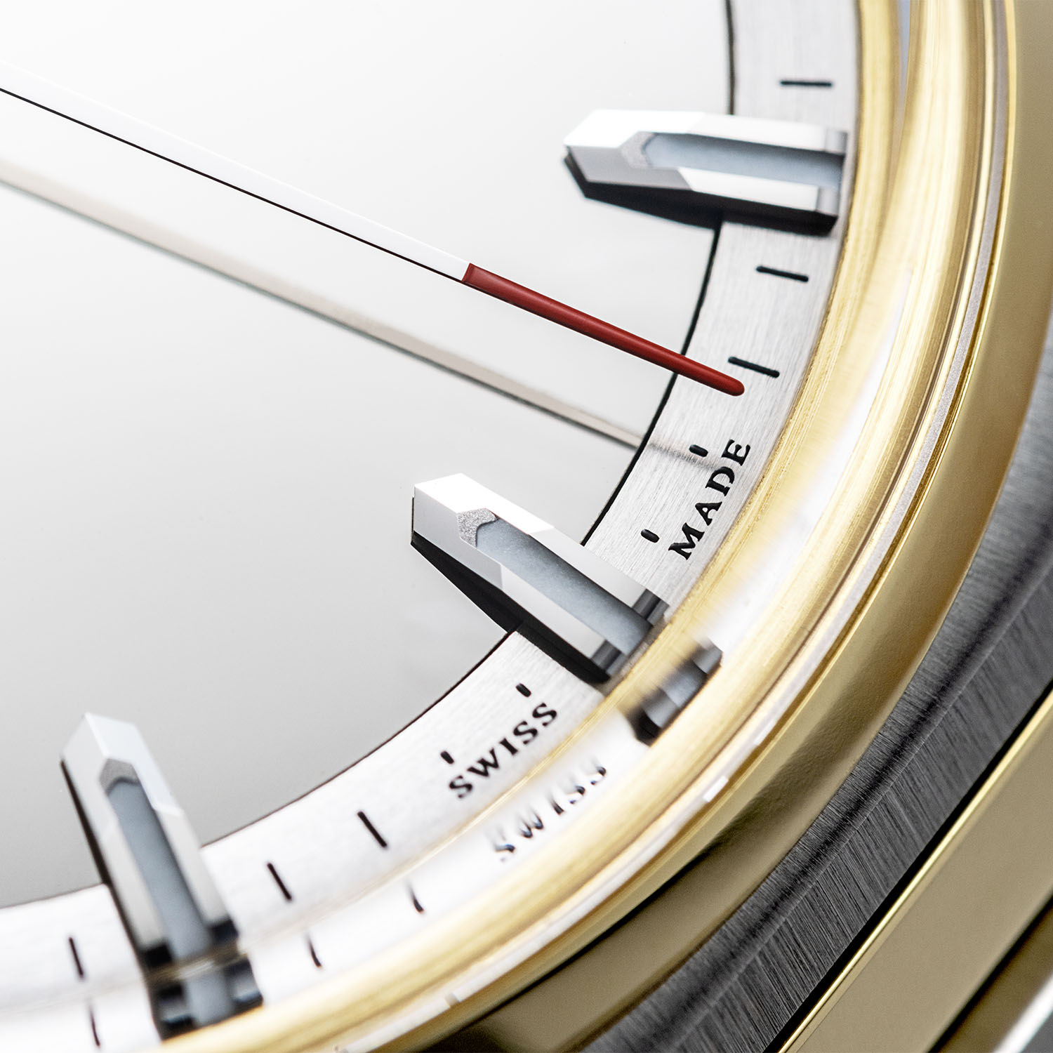 The mirrored dial with a touch of platinum is designed as a tribute to Sincere Watches’ Platinum Jubilee. Developed in collaboration with MD’Art, the dial is made from a single wafer of silicon – a material usually found on hairsprings. The thin disc of crystalline silicon is polished to create a perfectly smooth surface before a fine PVD coating of platinum is applied to amplify the reflective qualities of the silicon.