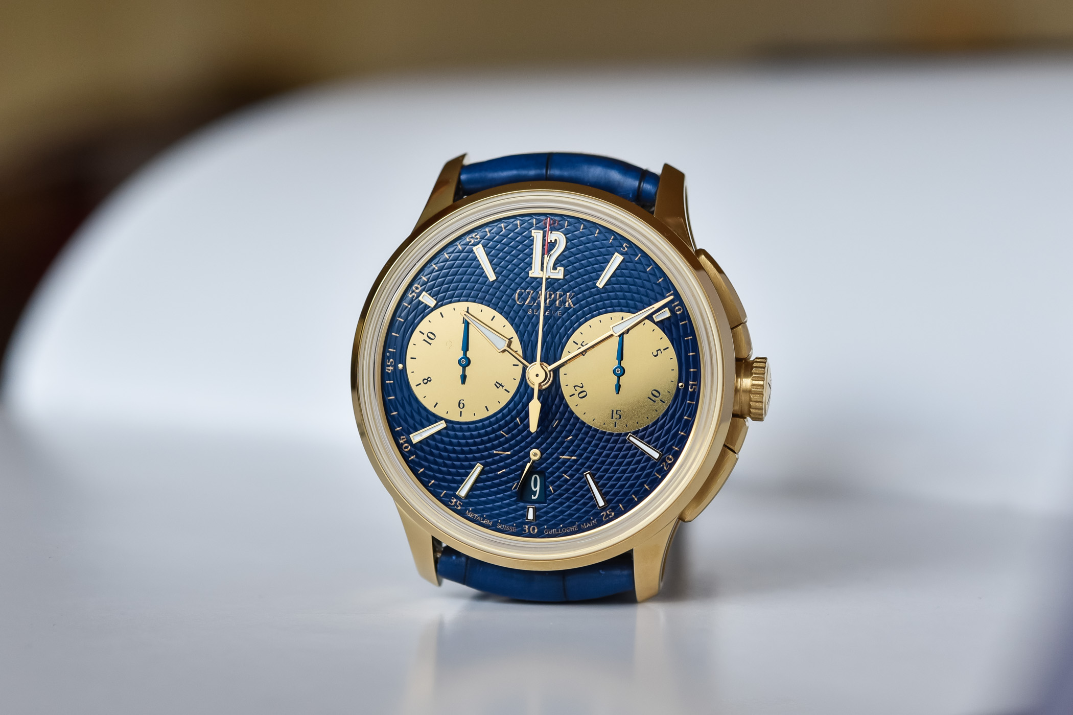 When it was revived in 2015, Czapek – a historically important name, paying tribute to Czech-born Polish watchmaker François Czapek, once the partner of Norbert de Patek – presented a highly classic watch with an elegant twist. Since then, the brand has evolved and now has far more to offer, including a successful take on the luxury sports watch concept. The collection also comprises a high-end chronograph watch, the Faubourg de Cracovie, which features an impressive proprietary integrated movement. Available until now in steel and titanium, this watch is unveiled today in two new gold-and-blue editions (available in yellow or red gold), with the Czapek Faubourg de Cracovie Océan d’Or.