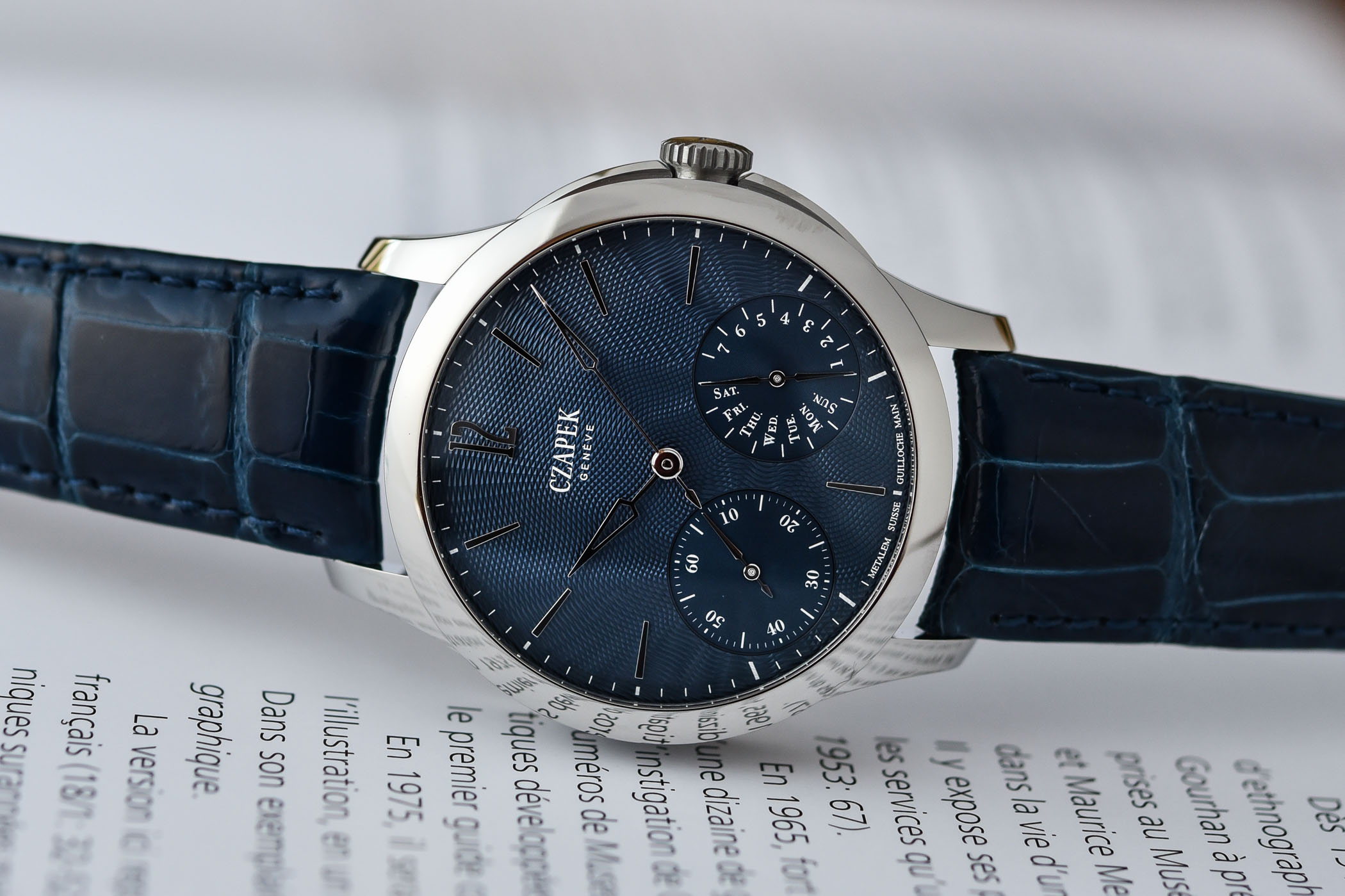 The Quai des Bergues was the first model produced since the brand was resurrected in 2015. The watch is a modern interpretation of a pocket watch created by François Czapek in the 1850s, and in particular by the characteristic position of its subdials. In 2017, Czapek unveiled a guilloché pattern named “guilloché ricochet“. It was also inspired by a design from François Czapek. It is achieved using two focal points to create a wave interference effect on the dial.