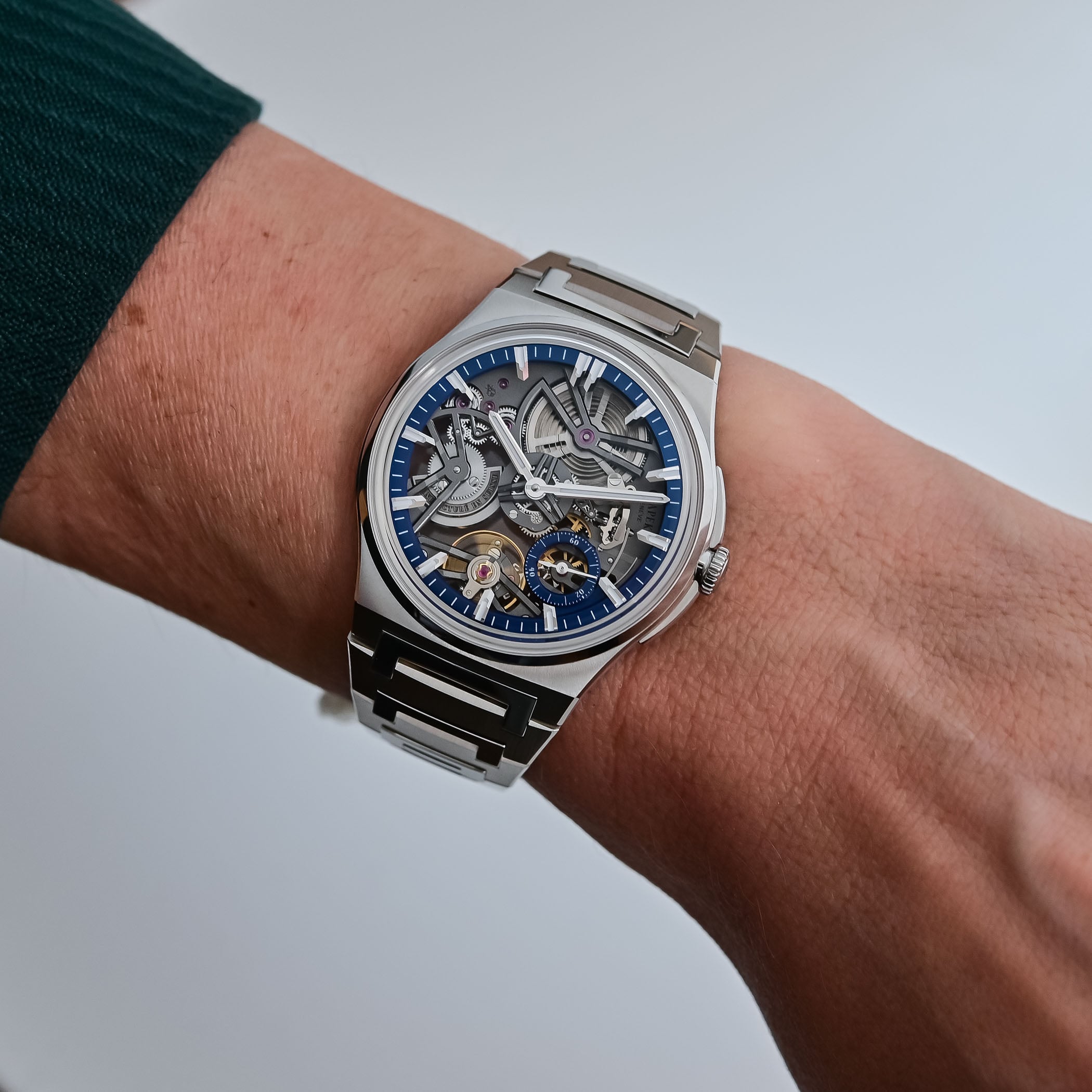 The Antarctique Tourbillon Cosmic Blue is the most technically elevated of the trio, built around calibre 9 and a dial-side flying tourbillon display. With a similar mission to the Révélation, the design principle was to display the key elements of its calibre on the dial. Aligned vertically, the tourbillon, gear train and barrel float above the dial’s hand- guilloché Singularité pattern, which gives the watch a striking sense of depth. The titanium version amplifies that effect by pairing the light metal with the intense Cosmic Blue dial. The Tourbillon is only available in a 40.5mm case size. Price is CHF 67,000.