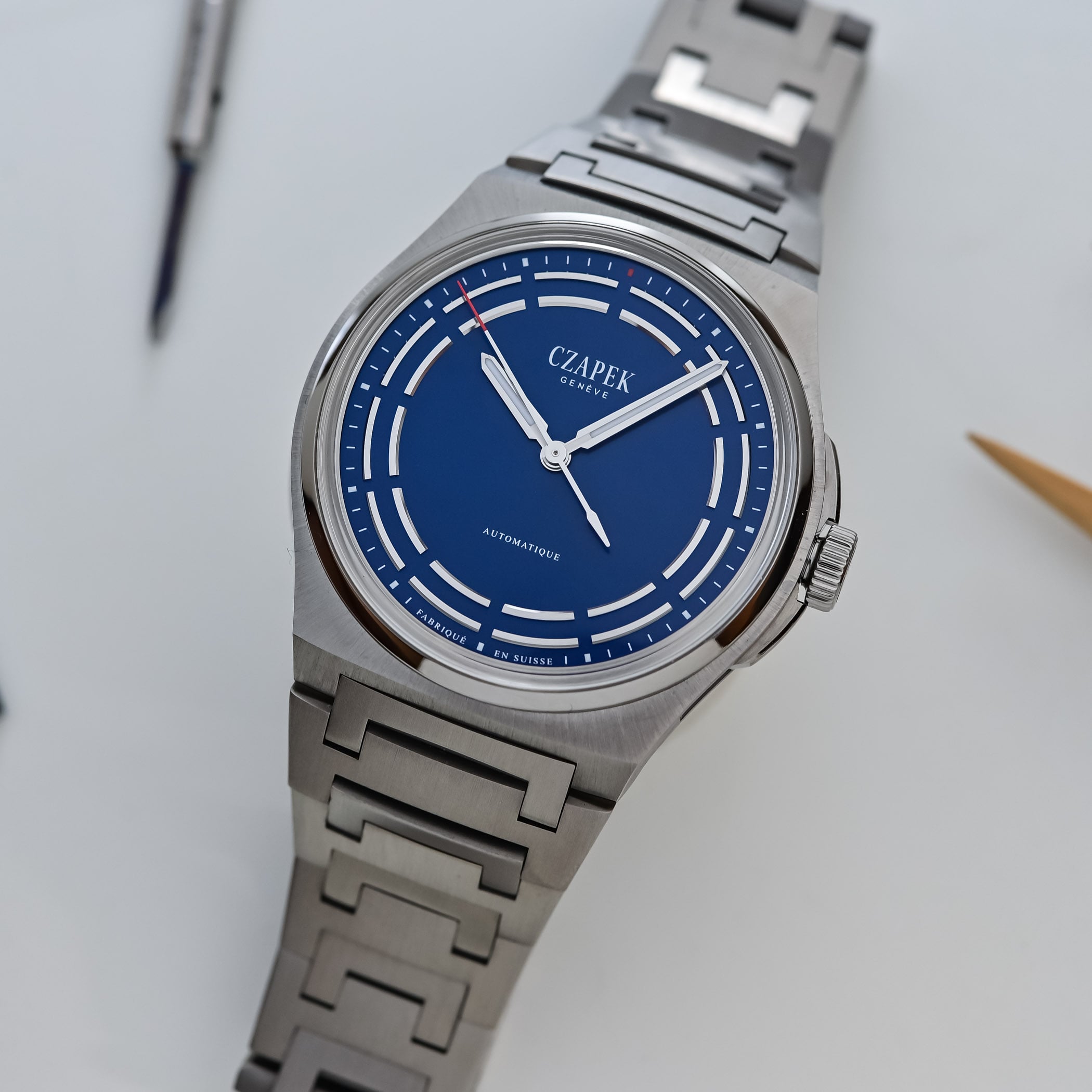 While the overall specifications of the Antarctique models remain the same, the combination of titanium’s muted grey tones and Czapek’s proprietary Cosmic Blue works very well. Known for its lightweight yet durable qualities, titanium is also notoriously difficult to machine. As members of the Antarctique family, the models share a flat, tonneau-shaped case with rounded crown guards on the right, a narrow, round, polished bezel with a glass-box sapphire crystal, and an integrated bracelet with C-shaped central links. For the first time, the integrated titanium bracelet can be ordered with fully brushed links for a sportier appearance or a combination of brushed and polished links for a more refined look.