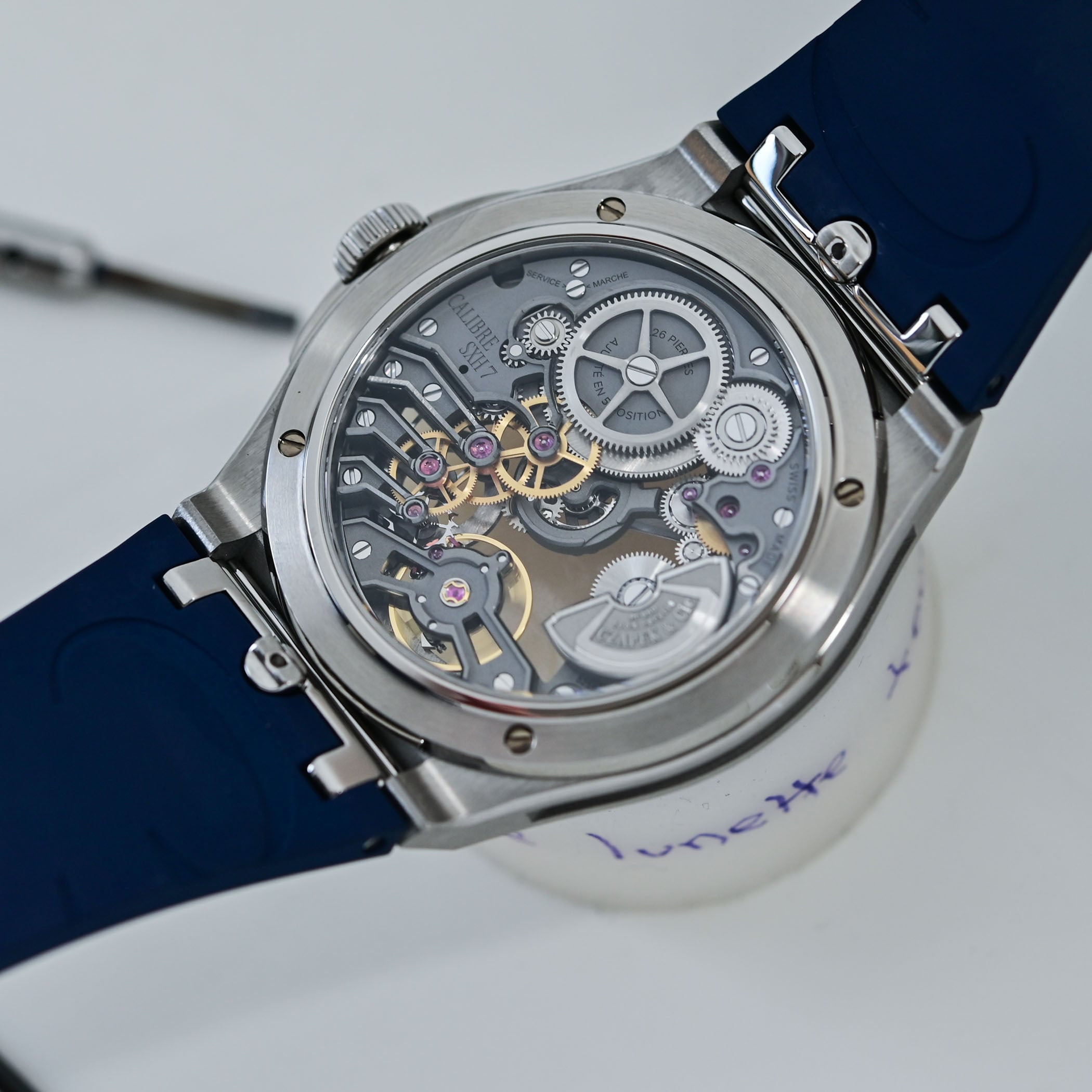 Another common feature shared by the Dark Sector and Révélation is Czapek’s first in-house calibre, SXH5 (and its openworked re-engineered SXH7), with its off-centred recycled platinum micro-rotor, a 60-hour power reserve on a single barrel, and a variable-inertia balance oscillating at 4 Hz, held beneath one of seven finger bridges – five of which are openworked to reveal the movement.