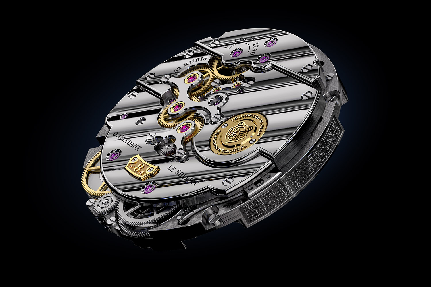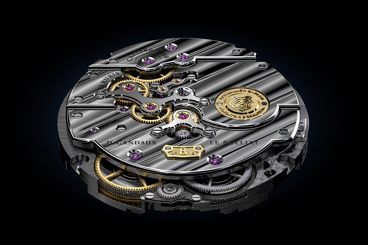 Just like the dial, the movement is inclined (wheels and bridges). The bridges are no longer forming a flat uniform surface but are cascading. This highlights their decoration and accentuates the reflection of light on their superb angles. The movement finish is indeed impressive all the more that the plate and bridges are crafted from untreated titanium, with the exception of the small steel bridge! These are decorated with “côtes du Solliat”, a new (and superb) type of stripes elaborated by David. The anglage and polishing of all parts are top-notch.