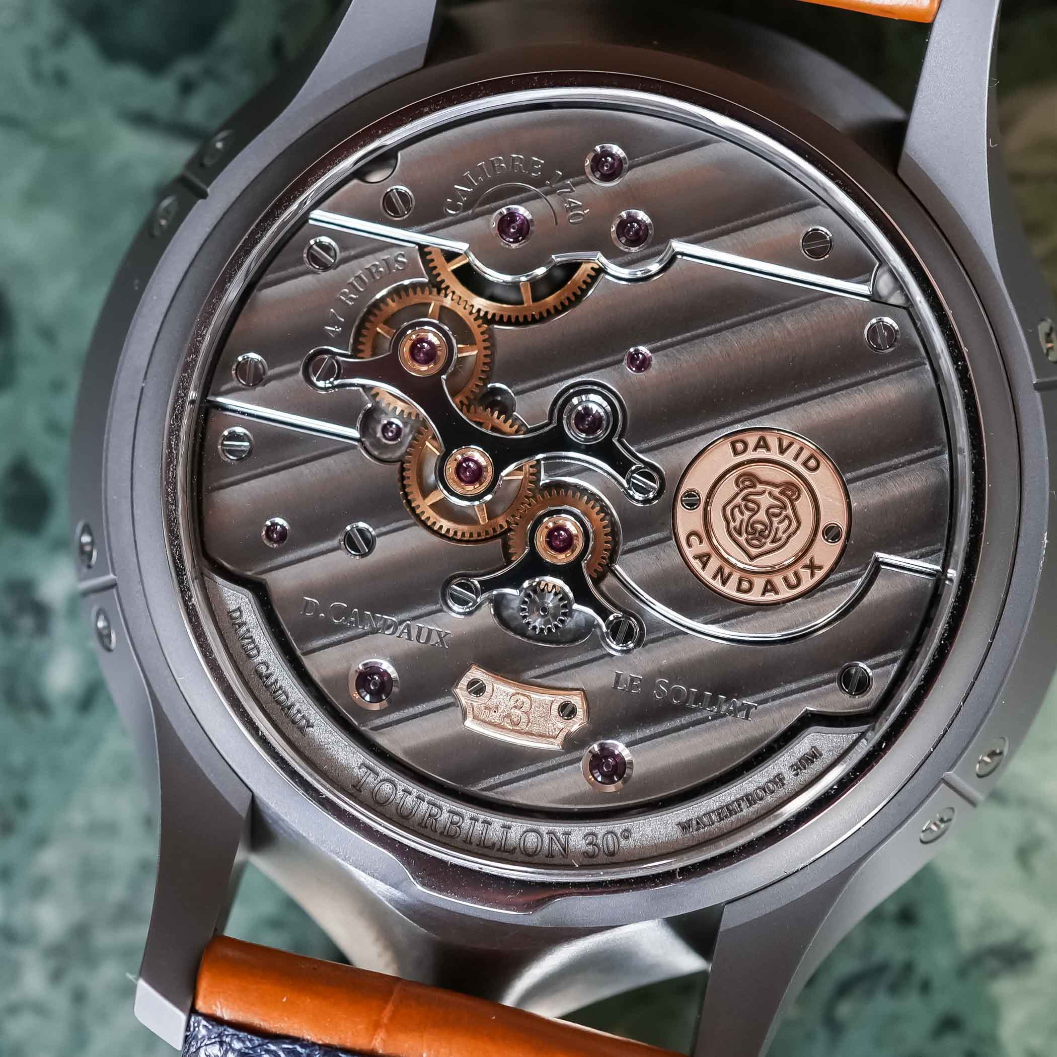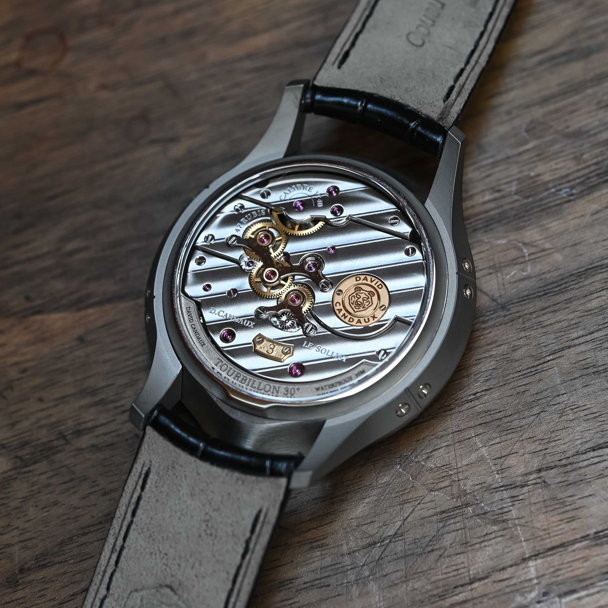 The caseback is engraved with the markings “Tourbillon 30°,” “David Candaux,” and “Waterproof 30M.” Across the bridges, the inscriptions “D. Candaux” and “Le Solliat” further emphasize the watch’s origins and craftsmanship, completing the evident artistic and technical brilliance.