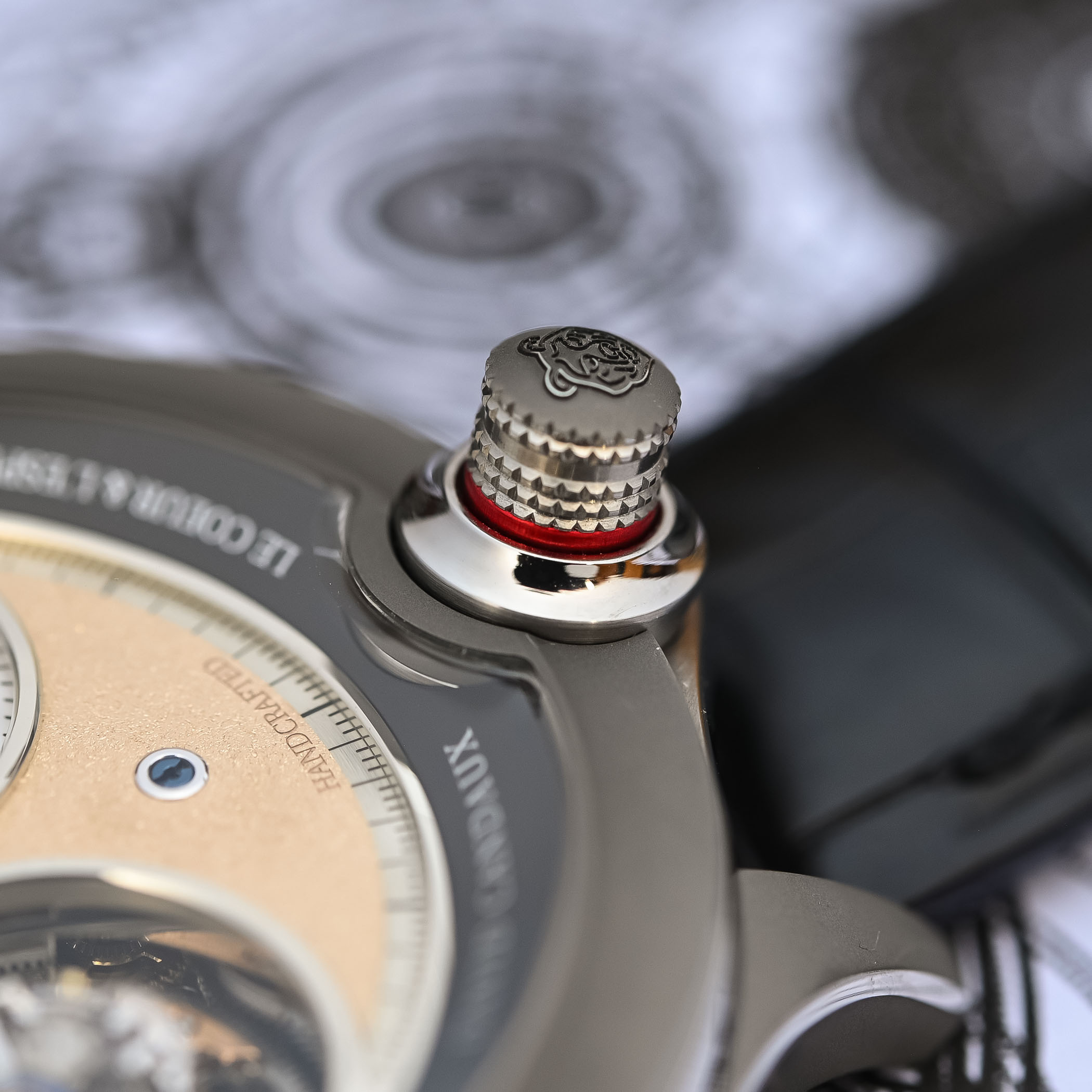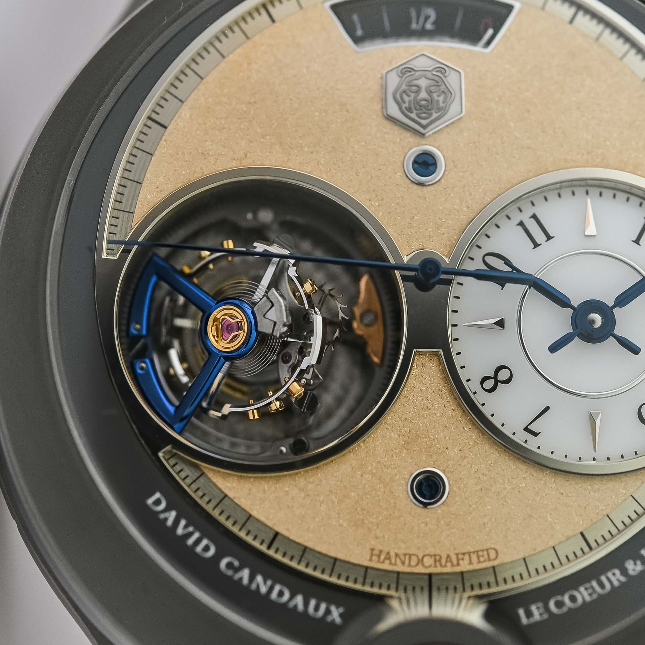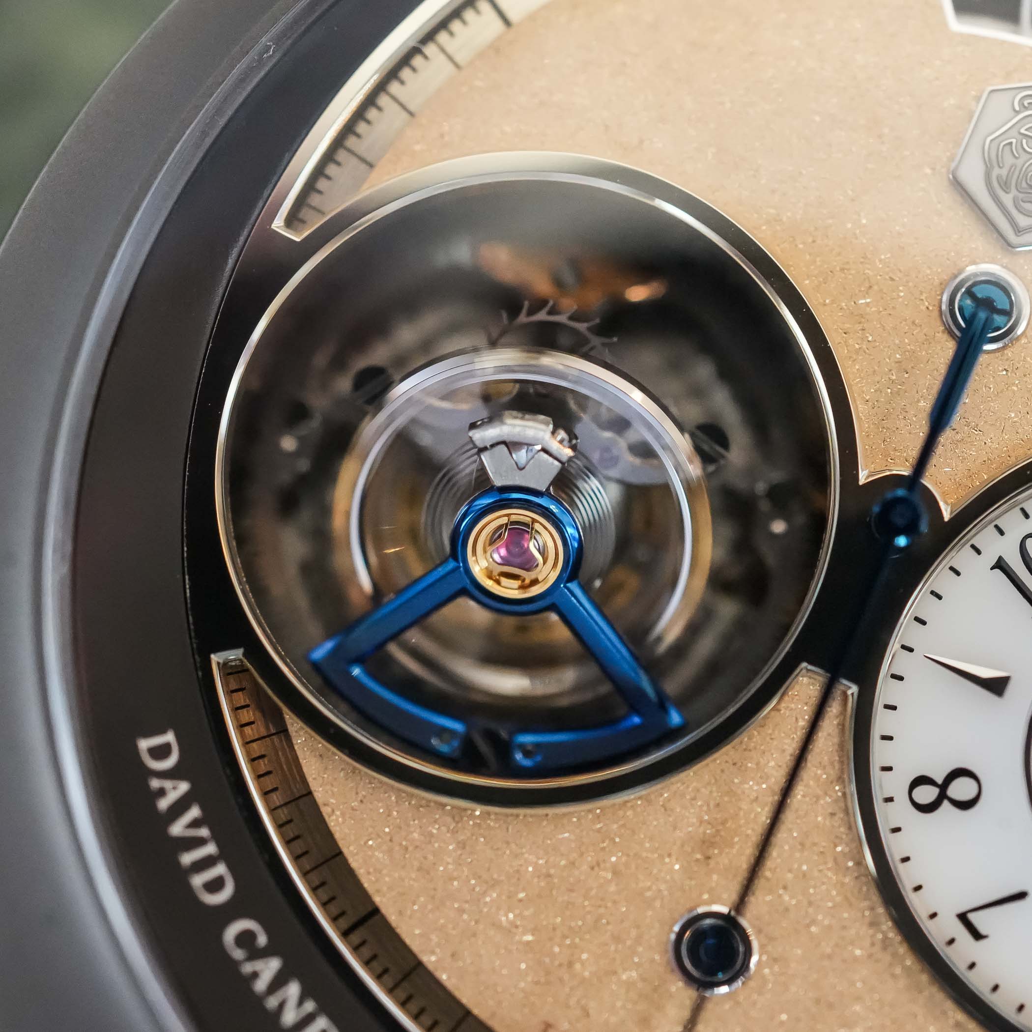 This revelation culminated in 2017 with the debut of the DC1, the first watch under the eponymous David Candaux brand. A piece of originality, the DC1 featured a distinctive “magic” push-button crown positioned at 6 o’clock, a 30-degree inclined flying tourbillon at 9 o’clock opposite the hour-and-minutes subdial, and what is believed to be the world’s first movement incorporating titanium components.
