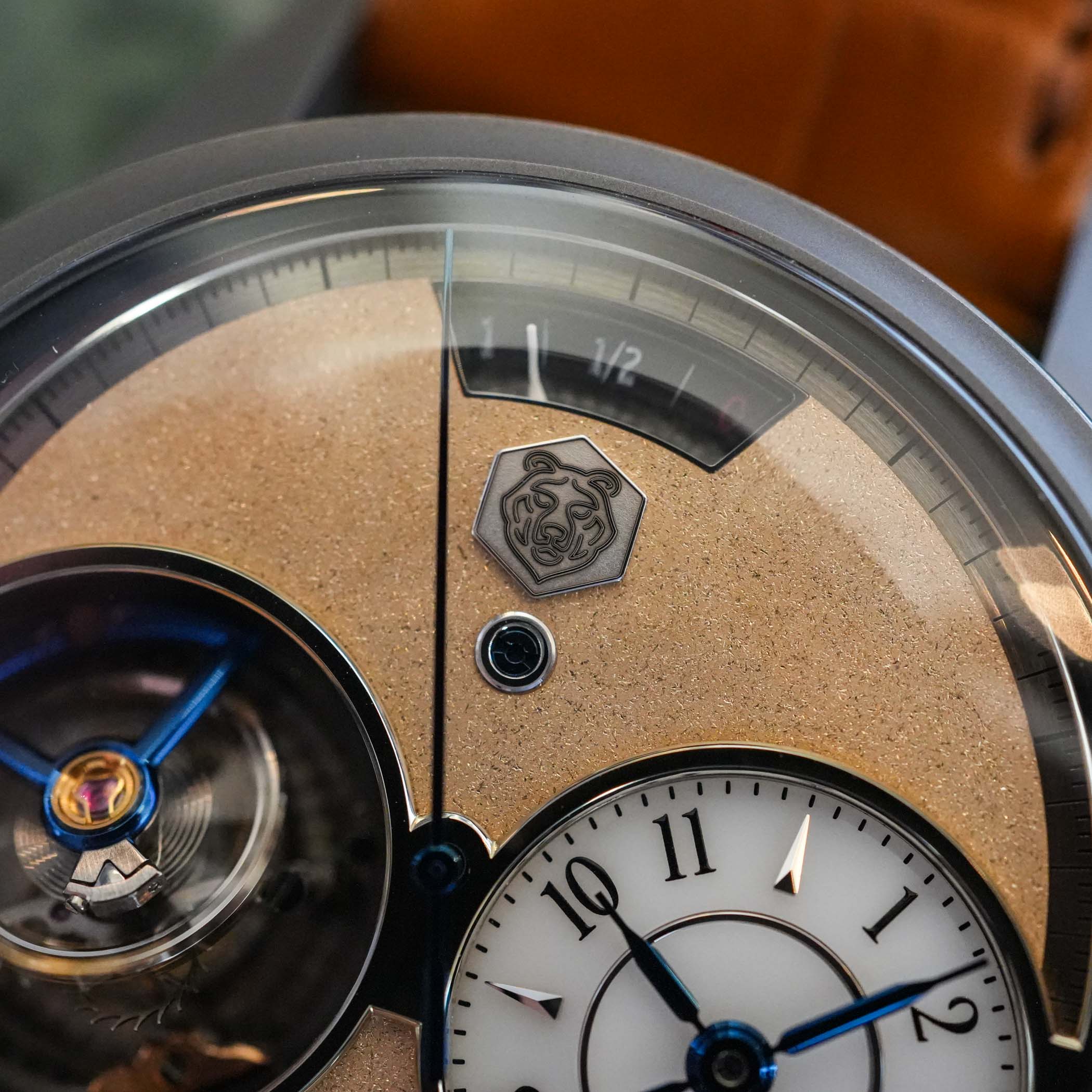 The DC1’s sapphire caseback offers a stunning view of the impeccably finished movement, with its titanium bridges inclined at 3 degrees. These bridges are adorned with the brand’s signature Côtes du Solliat stripes, their sharp bevels catching the light with a radiant shine. A gold medallion featuring the brand’s emblem—a bear’s head, a tribute to Candaux’s Vallée de Joux roots which also appears on the crown and dial—is affixed with two screws.