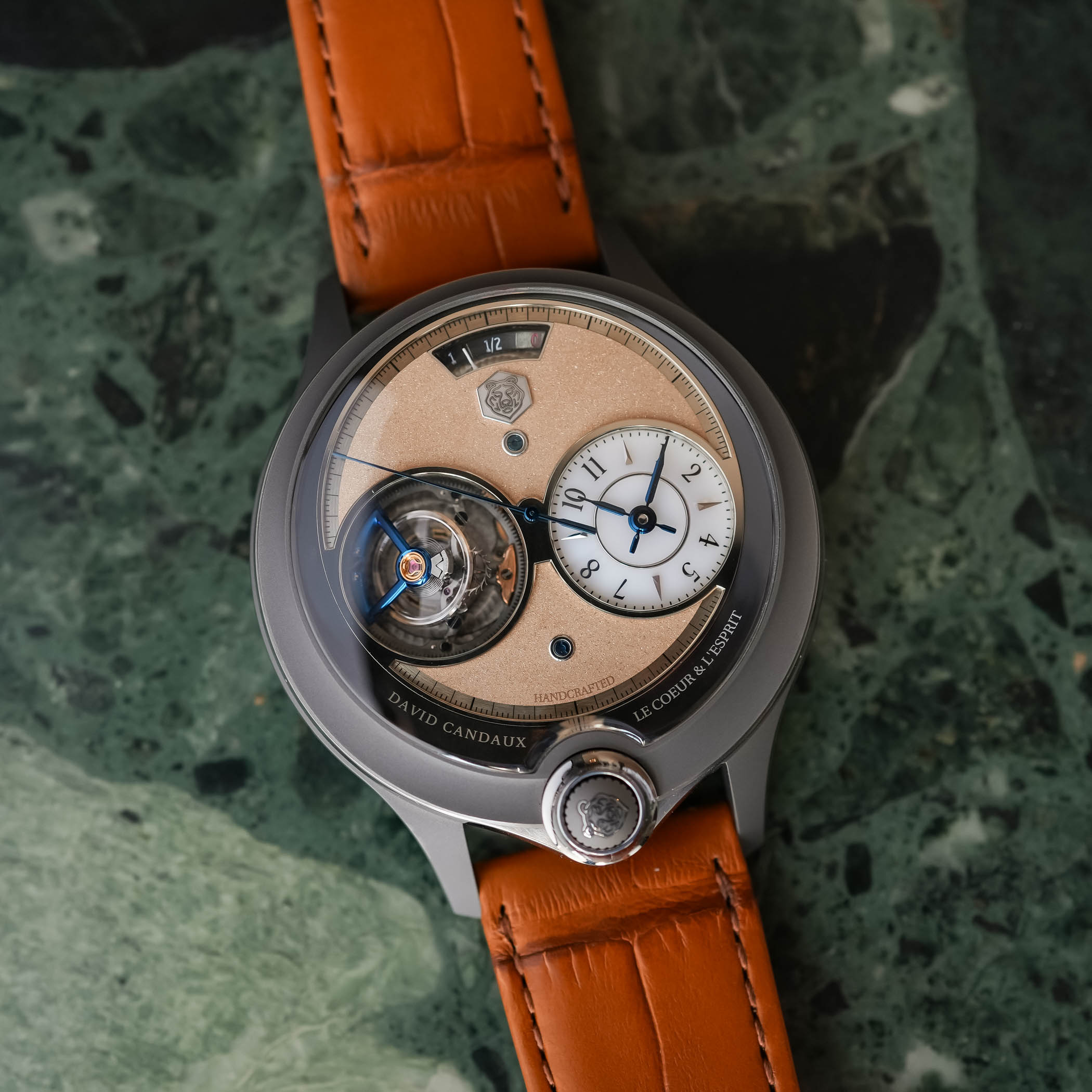 Curved side lugs enhance this natural fit, while at 6 o’clock sits the patented Magic Crown, a 31-component retractable system that stays flush with the case when inactive and springs out when pressed for winding and setting. Framing the crown are two black lacquer-filled plaques engraved with “David Candaux” and “Handcrafted”, a detail that reinforces the brand’s artisanal identity.