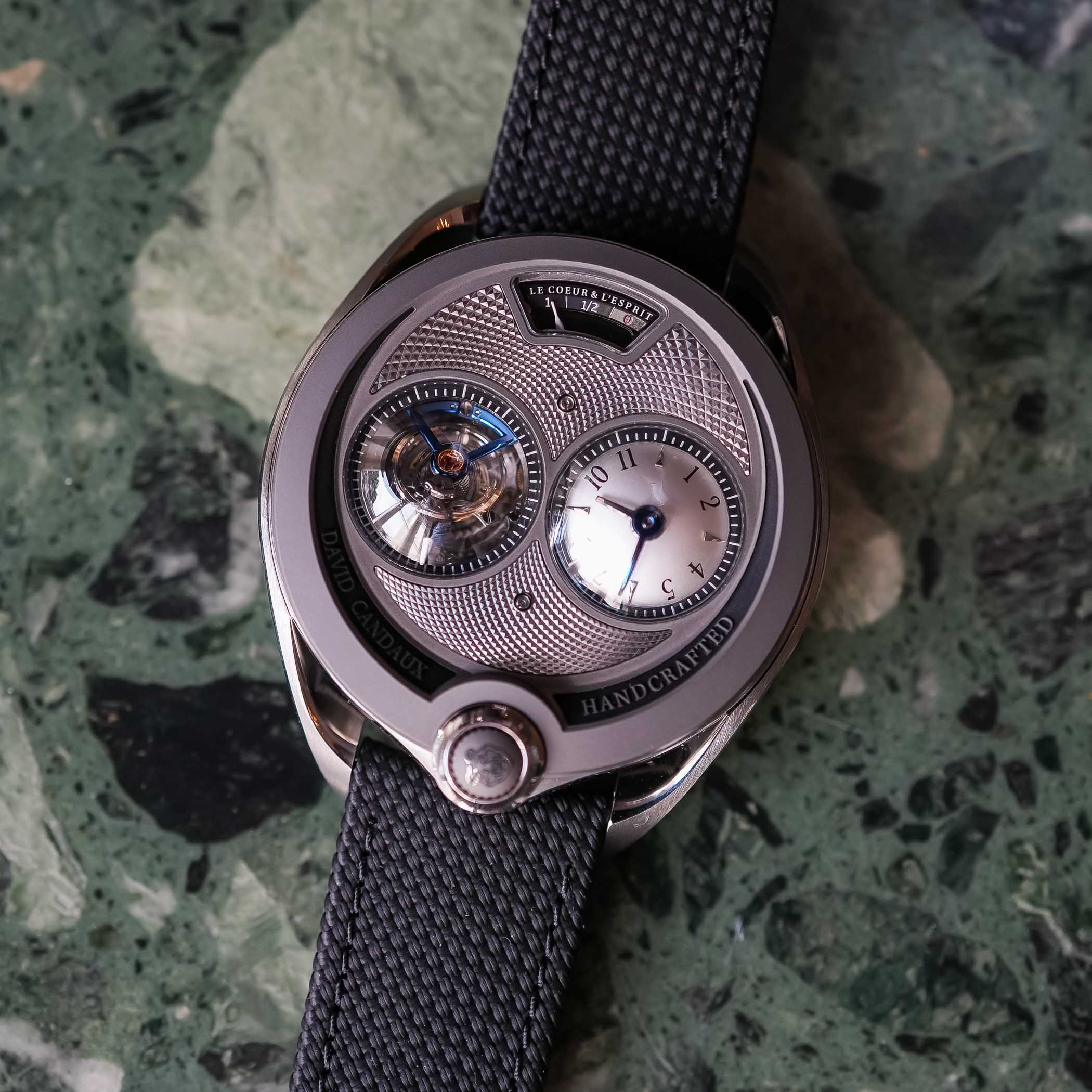 The DC7 Blue Hawk is worn on a supple, handmade rubber strap, available with a Velcro closure, folding clasp, or pin buckle, engraved with the David Candaux logo. Combined with the curved lugs and polished titanium case, this makes the 44mm watch surprisingly balanced and comfortable, despite its visual complexity.
