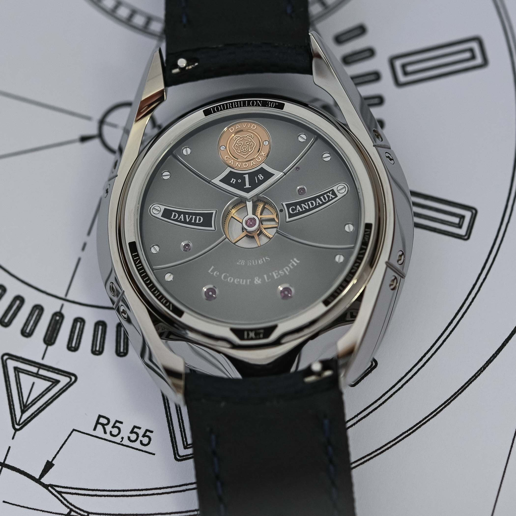 Driven by two fast-rotating, coaxial barrels, the calibre delivers a robust 72-hour power reserve and beats at 21,600 vibrations/hour. Finishing remains true to the finest traditions of haute horlogerie, featuring hand-polished bevels, straight-grained titanium bridges, a black-polished tourbillon bridge, and inward angles that attest to hours of artisanal work. Fine details, like ruby jewels set in solid gold chatons and an engraved yellow gold medallion bearing Candaux’s bear-head emblem, underscore the movement’s refinement.