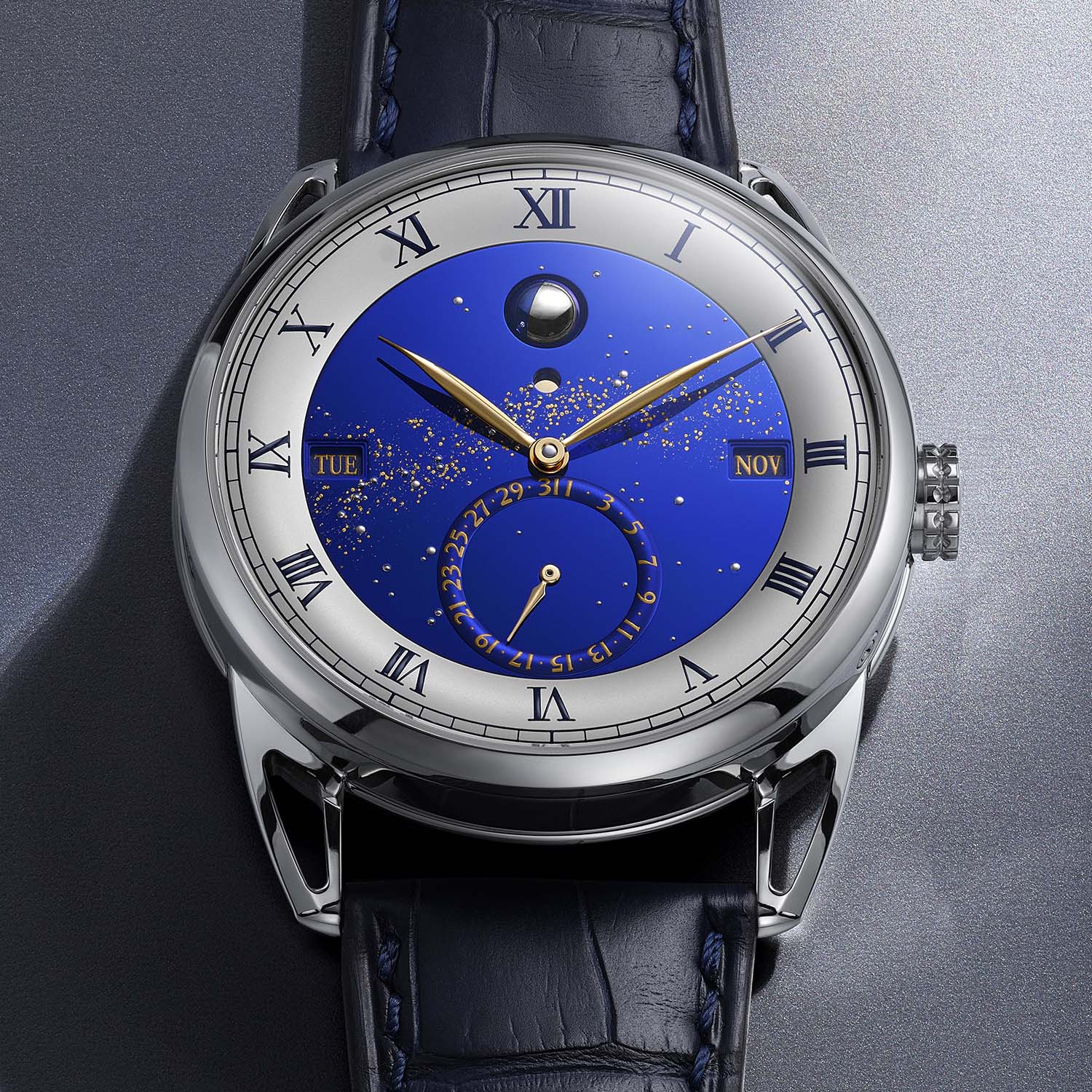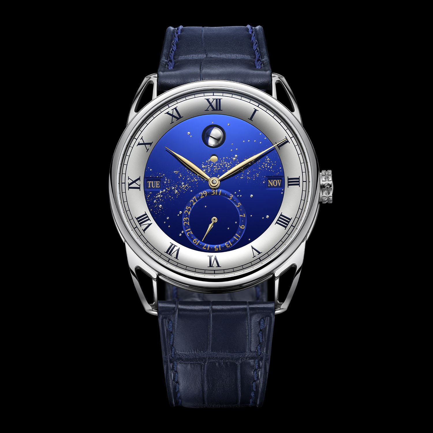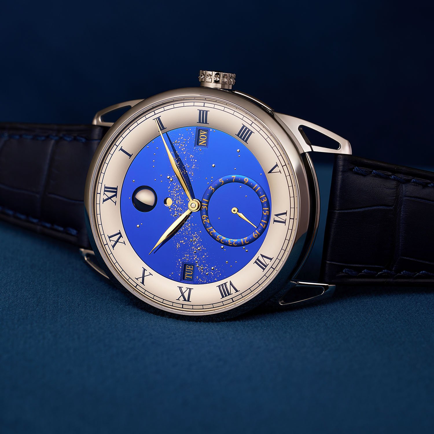 The perpetual calendar indications are laid out on a multi-level structured dial. A blued, flat-polished titanium sky forms the upper plane and is populated with hand-fitted white gold star pins; the Milky Way is laser-micromilled and inlaid with 24-carat gold leaf (bespoke personalisation of the sky is possible). A silver-toned hours ring with Roman numerals frames the sky, with the minutes track running the outermost edge. Day and month appear in rectangular apertures at 9 and 3 o’clock; date is shown on a subdial at 6 o’clock. The moon phase at 12 o’clock uses De Bethune’s patented palladium/blued-steel sphere, and the leap year indicator is right below. Time is read with hand-curved, mirror-polished yellow gold hands.