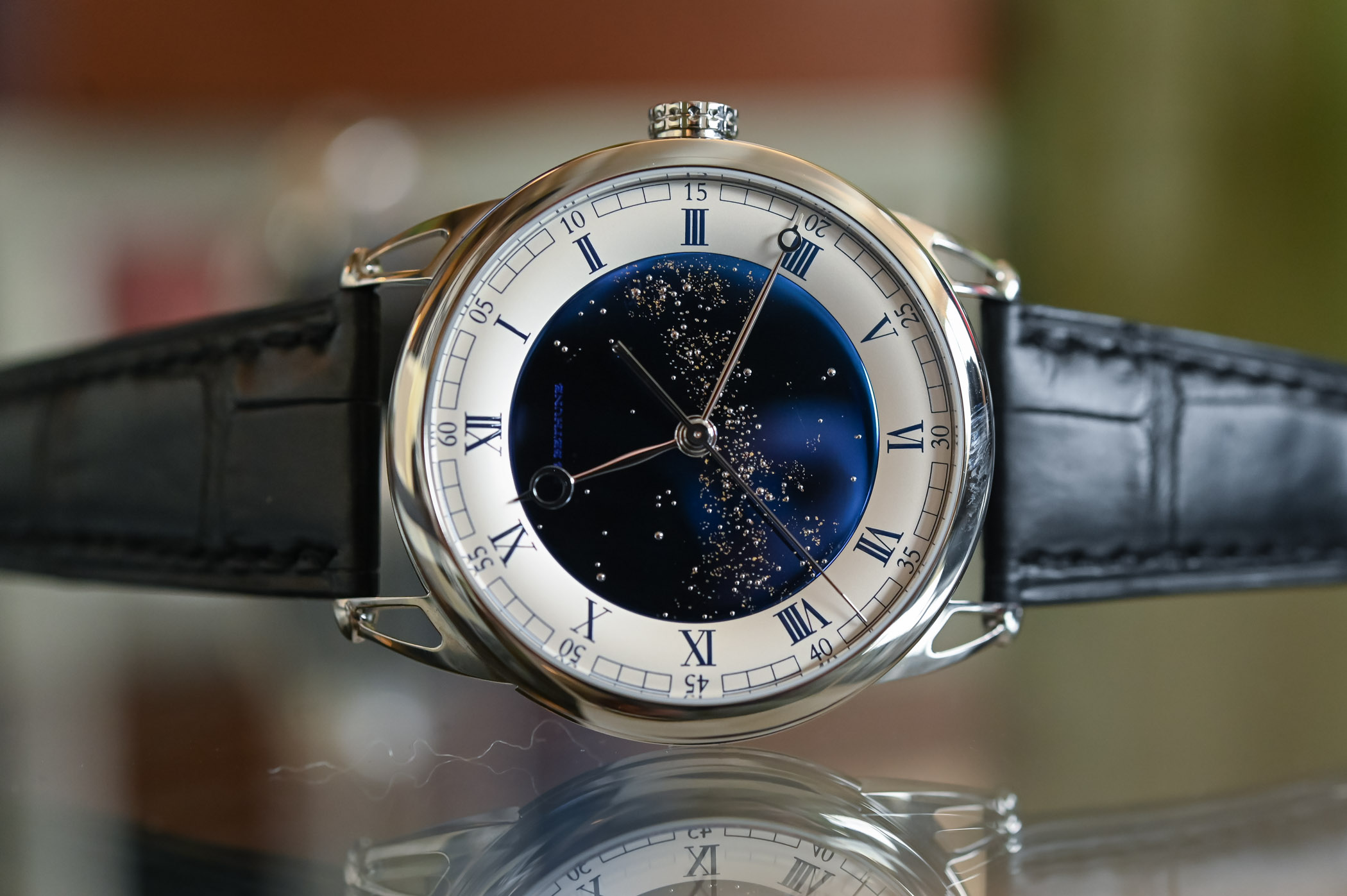 The Milky Way pattern and its characteristic haze are laser-milled and gilded with 24k gold leaf. This glittering sky can be personalized to represent the night sky of your choice, according to a specific date and location. The hand-polished pomme/Breguet steel hands provide a beautiful contrast.