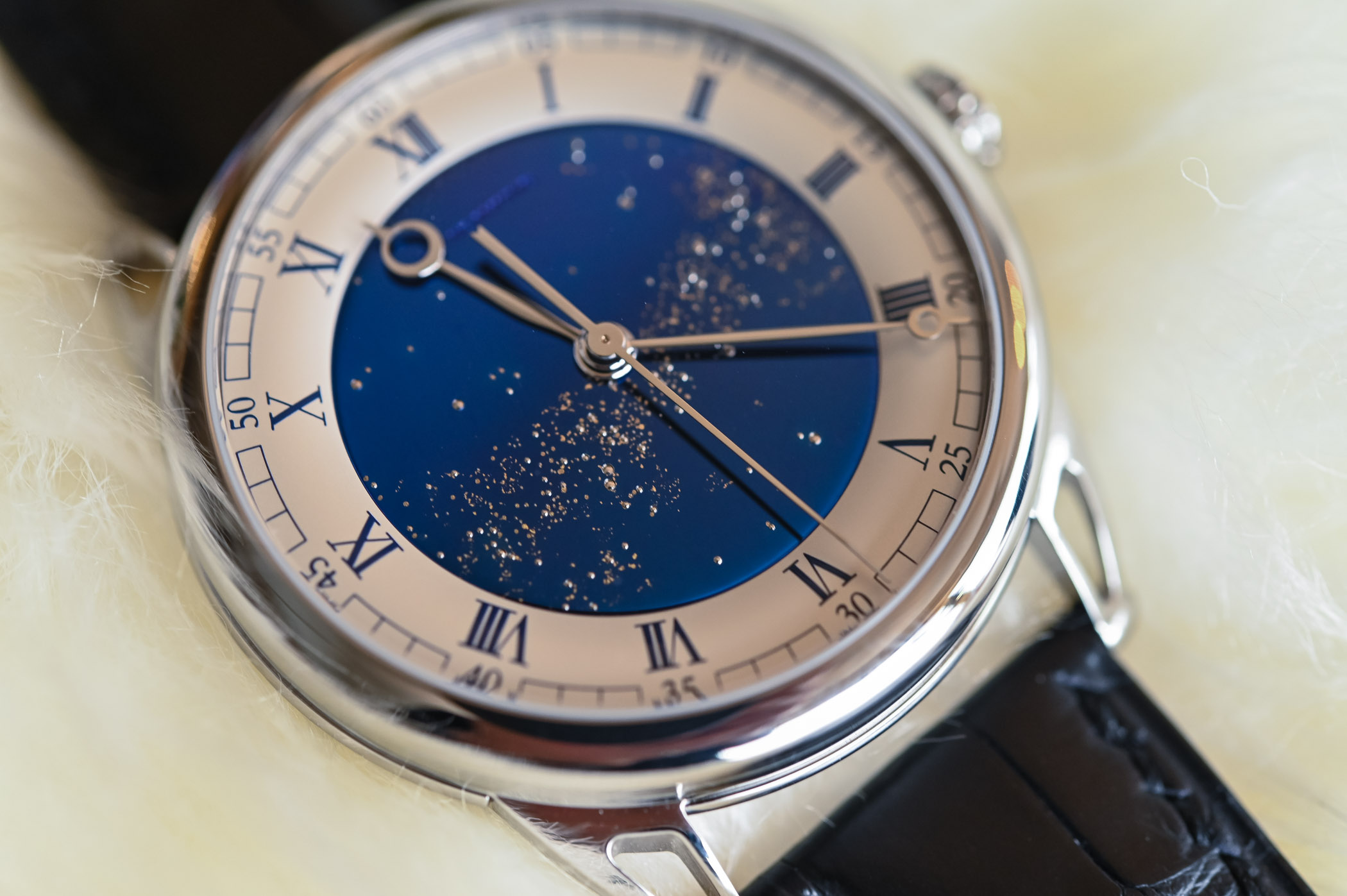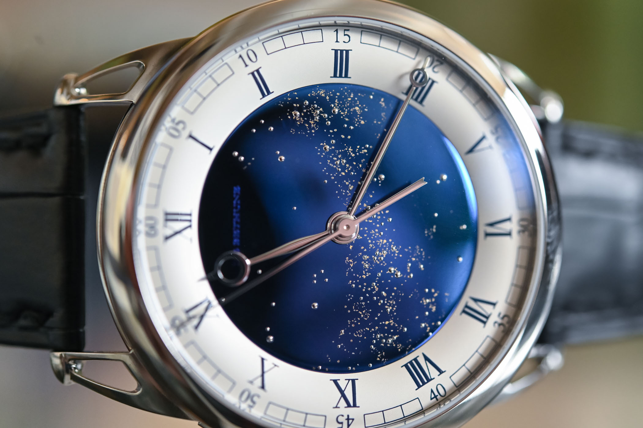 The Milky Way pattern and its characteristic haze are laser-milled and gilded with 24k gold leaf. This glittering sky can be personalized to represent the night sky of your choice, according to a specific date and location. The hand-polished pomme/Breguet steel hands provide a beautiful contrast.