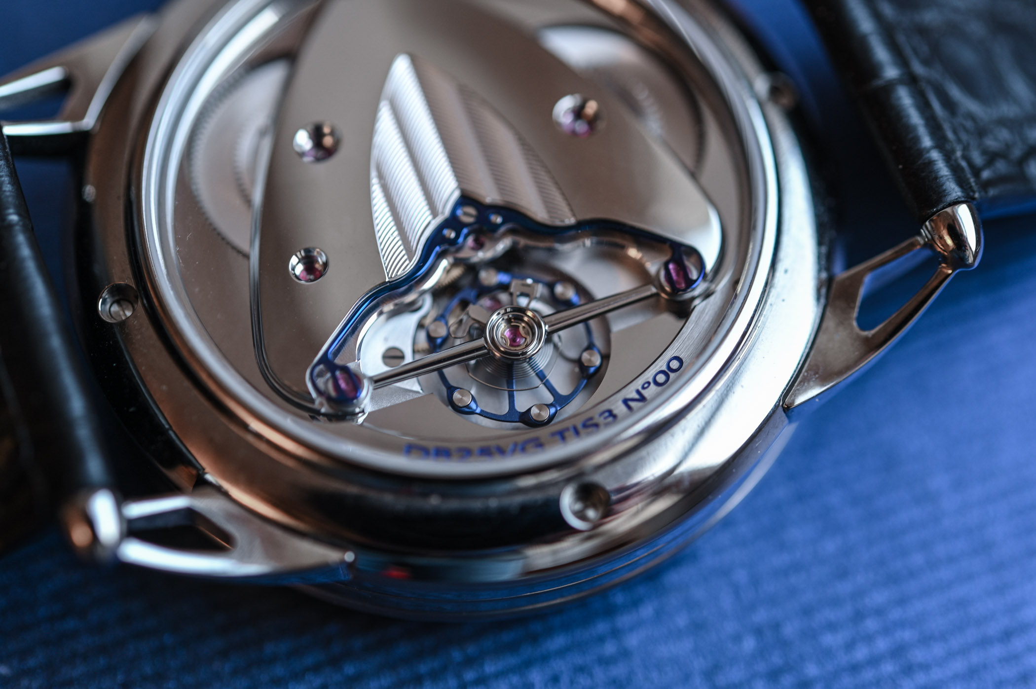 The hand-wound Calibre DB2507 is De Bethune’s 29th movement and can be admired through the sapphire crystal caseback with double anti-reflective coating. De Bethune’s signature delta-shaped main bridge features an extensive mirror-polished surface with a smaller area decorated with Côtes de Bethune enhanced with microlight engraving. Polished bevelled angles and polished slots for the rubies, along with the hand-snailed finishings on the two barrels, reveal the Haute Horlogerie pedigree of the watch.