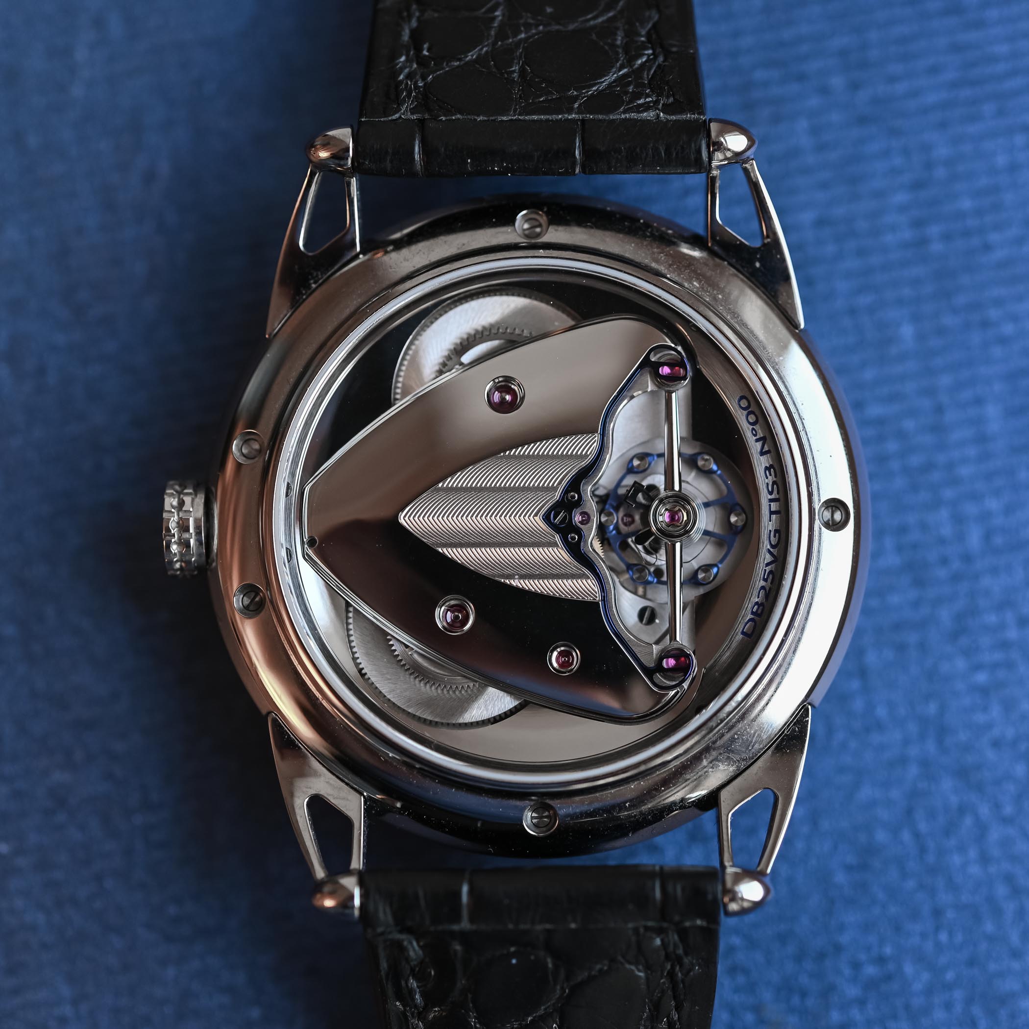 The Starry Varius sub-family of the DB25 includes the Starry Varius with its customisable night sky and the Starry Varius Chronomètre Tourbillon that won the GPHG 2018 Chronometry prize. Like the two Starry Varius models in collection, the 42mm case is made of polished grade 5 titanium, the lugs are integrated and openworked, the sapphire caseback reveals the movement and the dial is decorated with a starry sky and the hazy band of the Milky Way. Despite the more complex movement below, the case height of 11.8mm is relatively slim, just 3mm thicker than the simpler time-only Starry Varius.