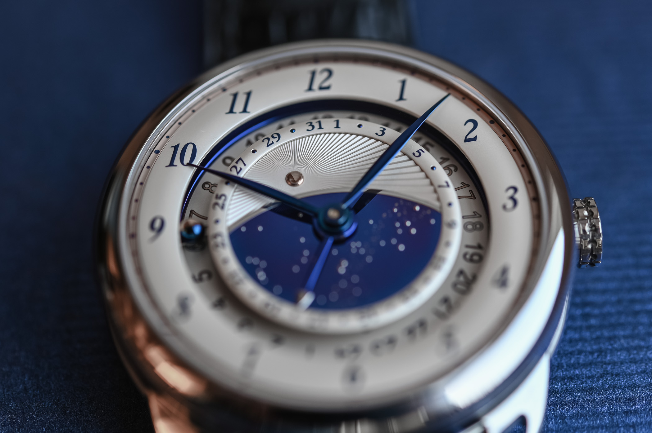 Local time is depicted on the raised and rounded silver flange on the periphery (almost like a doughnut) that hovers above a deep well. Flame-blued steel hands with bent tips to follow the curvature of the ring read the black Arabic numerals for the hours; the minutes, represented by blue dots, are located on the outermost rose gold ring. Local time is set at the crown in both directions.