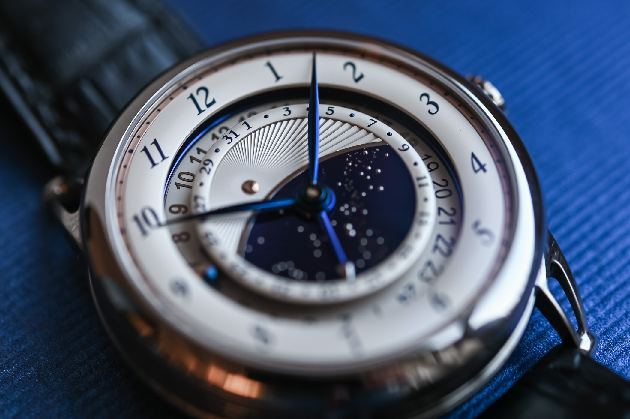 In a clear departure from most dual-time dial layouts, the DB25GMT Starry Varius relies on three concentric rings to relay the local time, home time and date. What is remarkable, though, is the impressive depth De Bethune has achieved on the dial thanks to the different heights, finishings and theatrical staging.