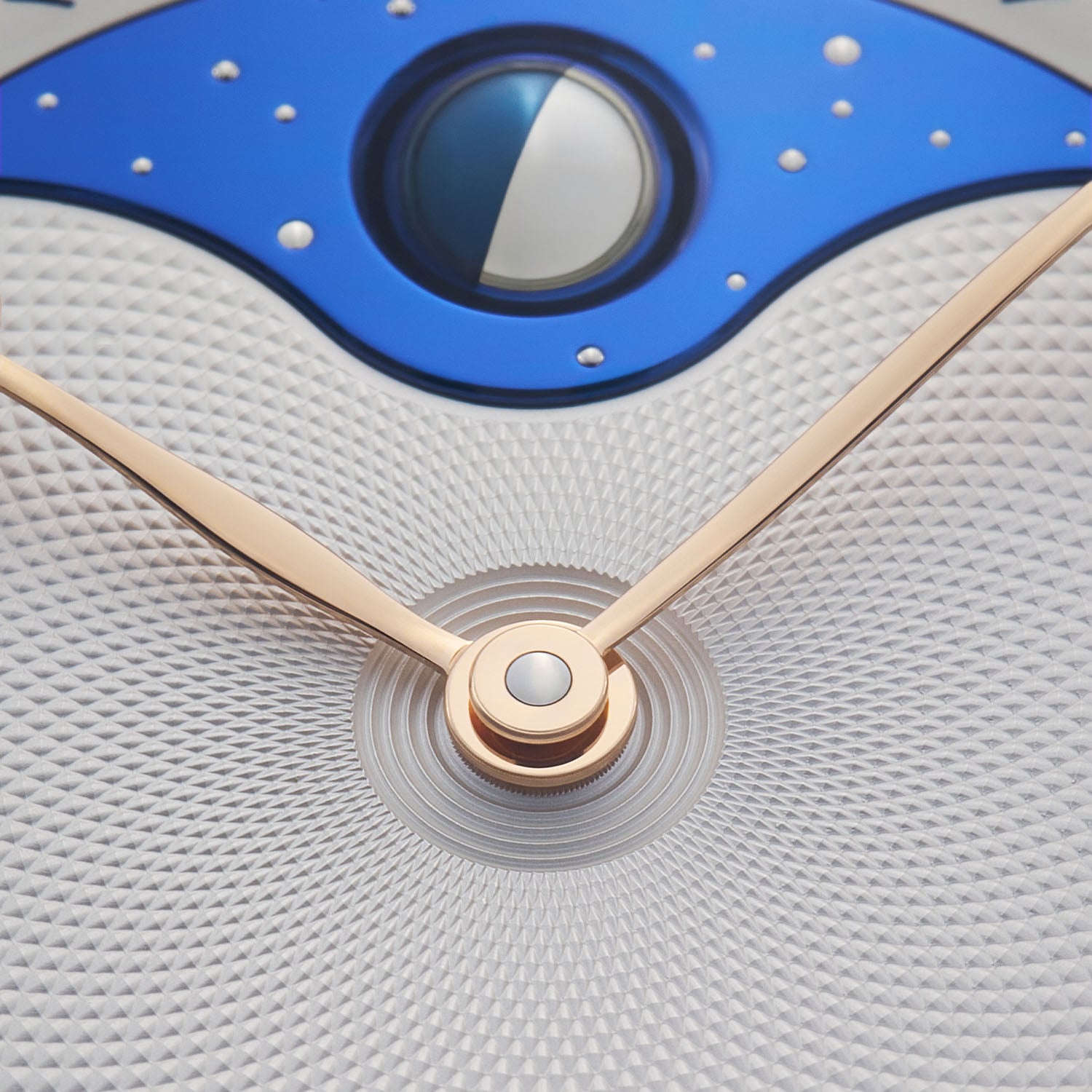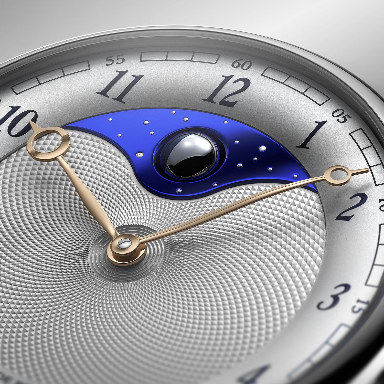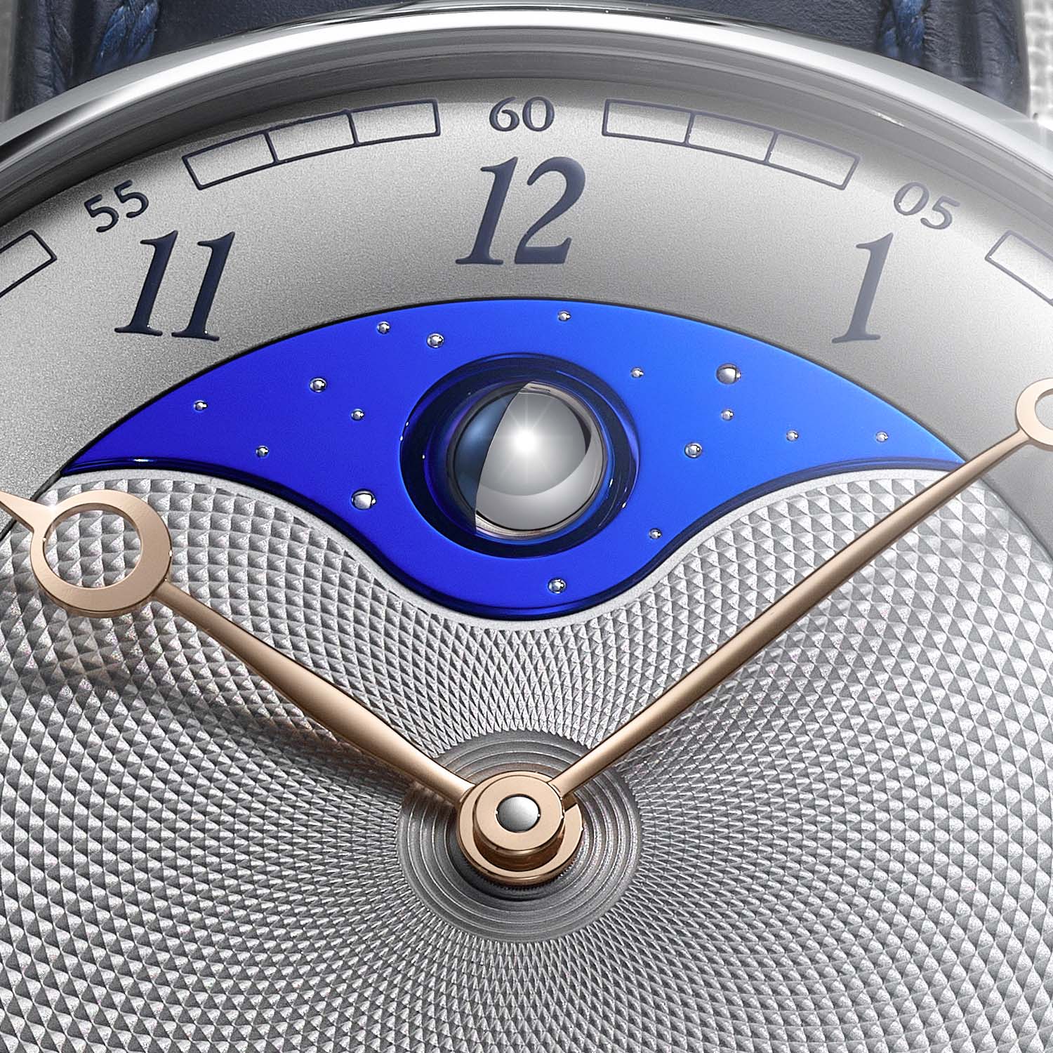 This pared-down version is housed in a smaller grade 5 titanium case that measures 40.6mm in diameter (compared to 44mm for the original DB25L) while retaining its drum shape, thin, rounded bezel and iconic hollowed, ogival-shaped lugs. The hand-guilloché barleycorn pattern on the silvered dial is paired with rose gold Breguet-style hands. These are hand-curved to glide over the three-dimensional moon. Fashioned from palladium and flame-blued steel, this compelling representation of our closest satellite emerges at 12 o’clock at the centre of a reshaped blued titanium sky with gold stars.