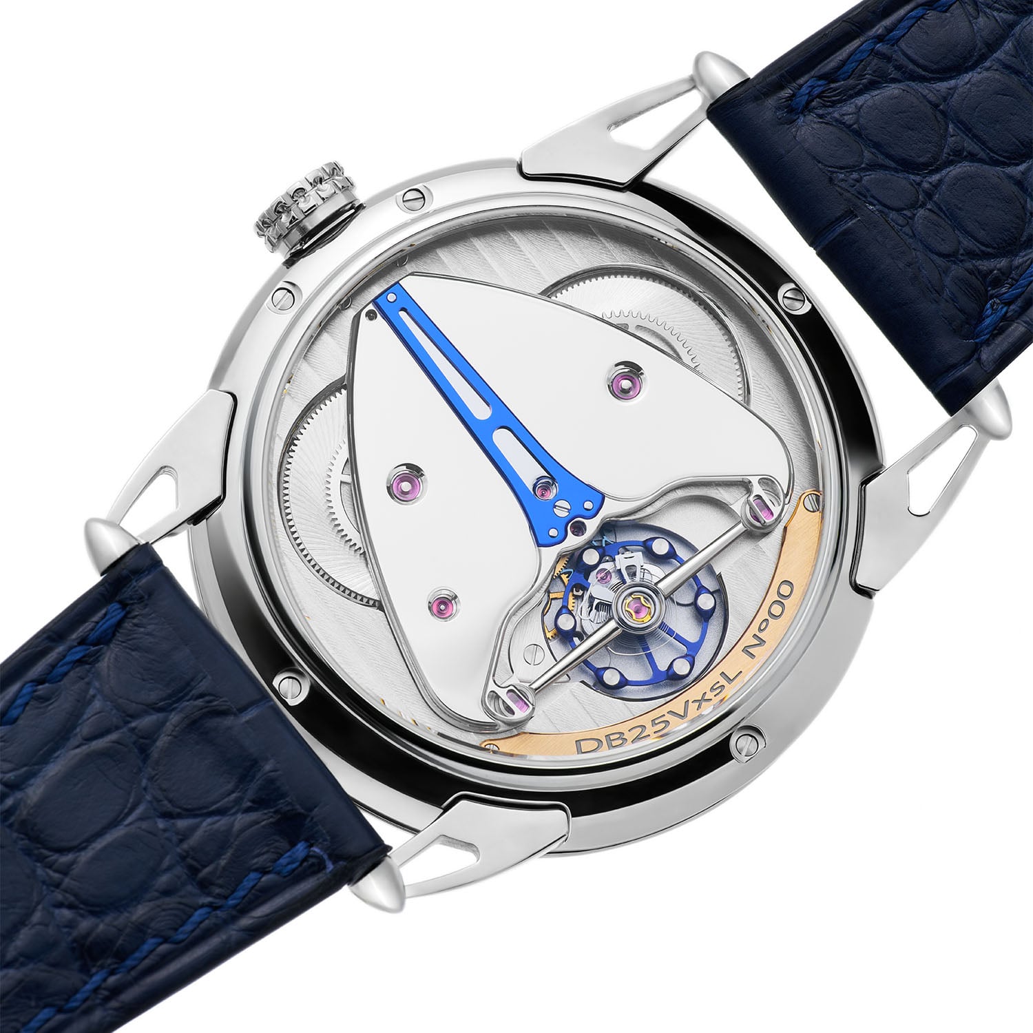 The De Bethune DB25Vxs Silver Moon is worn on an extra-supple alligator strap with a grade 5 titanium pin buckle. The price is set at CHF 82,000 (excl. taxes). More details at debethune.ch.
