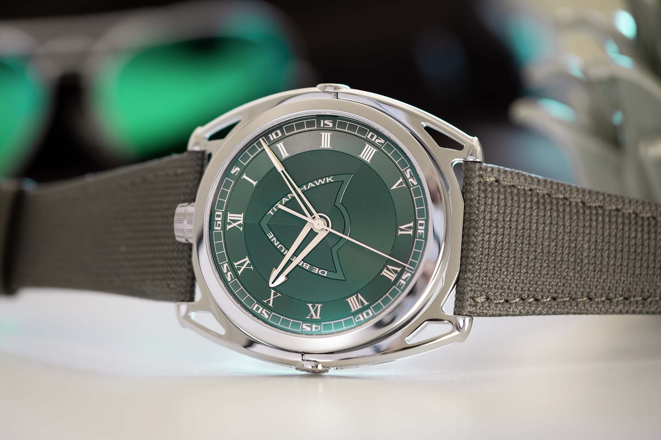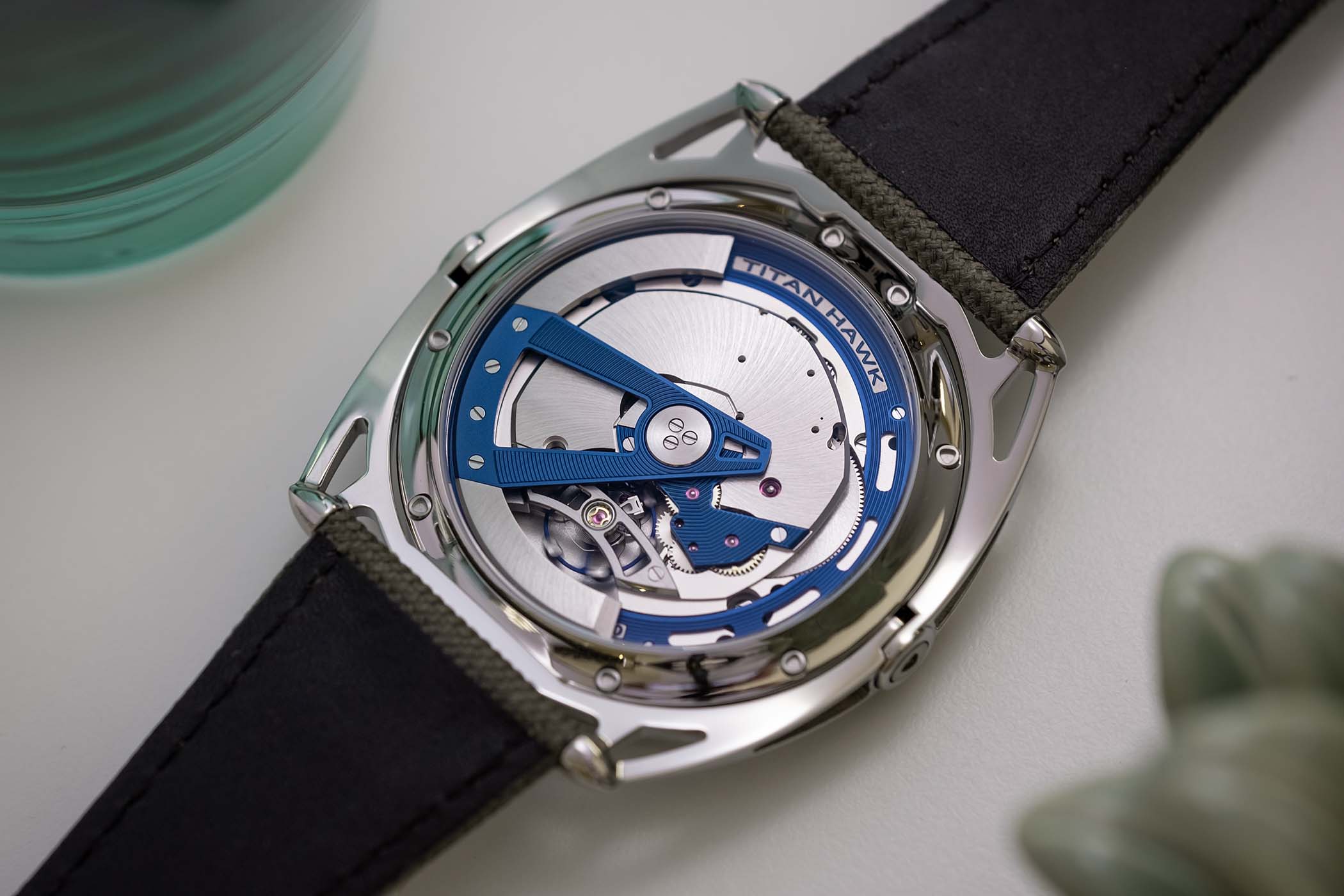The DB27 Titan Hawk range started in 2012 and has since seen a few guises. What all models have in common is the titanium case (matte or polished), spring-loaded swiveled and skeletonized lugs, crown at 12 o’clock and an automatic movement underneath a full dial. Originally featuring a date complication, indicated with a uniquely styled hand in the V1 model, this was replaced by the V2 model in 2018, swapping out the date function for central seconds.