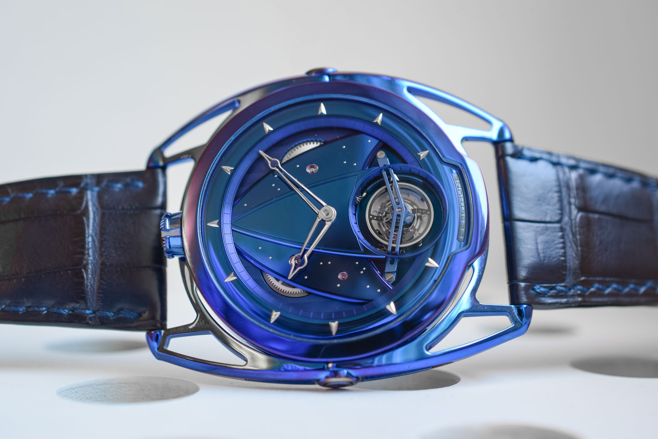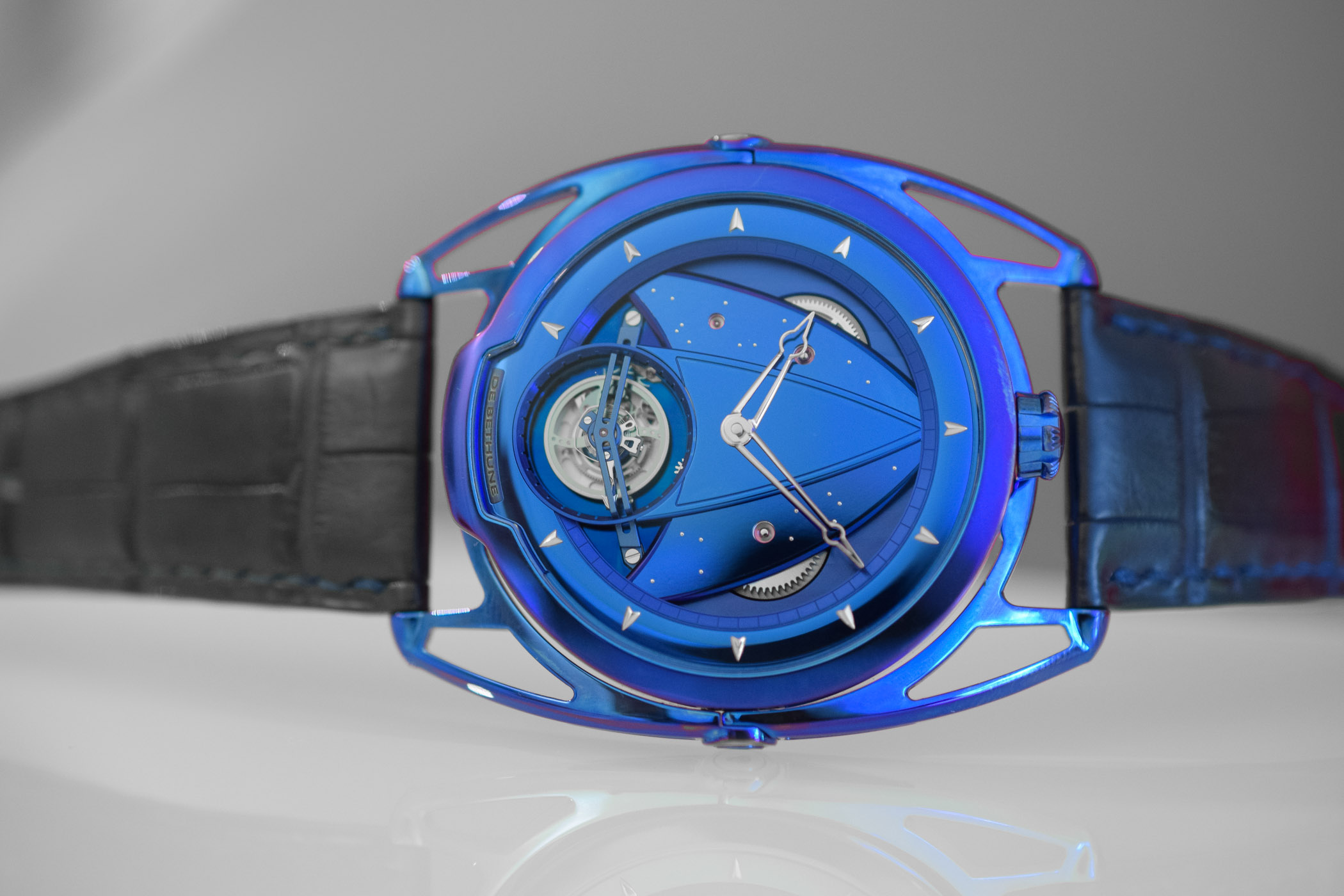 Time-honoured techniques to craft a futuristic cosmic blue vessel and a high frequency tourbillon for stable navigation though time and space.