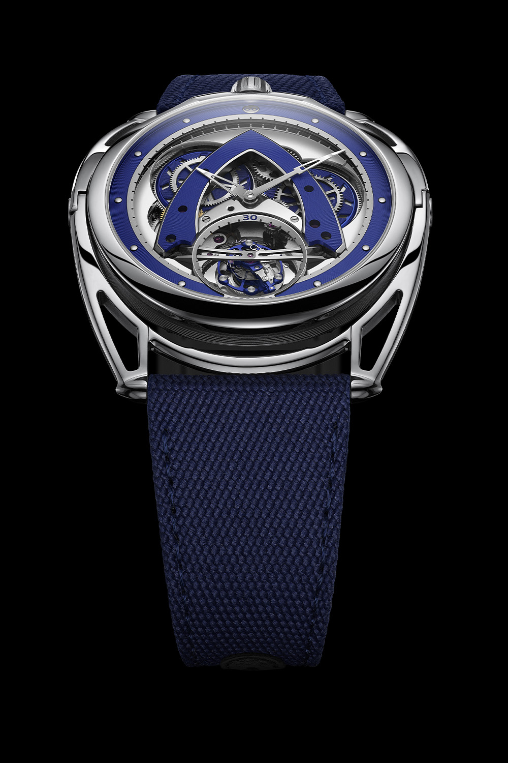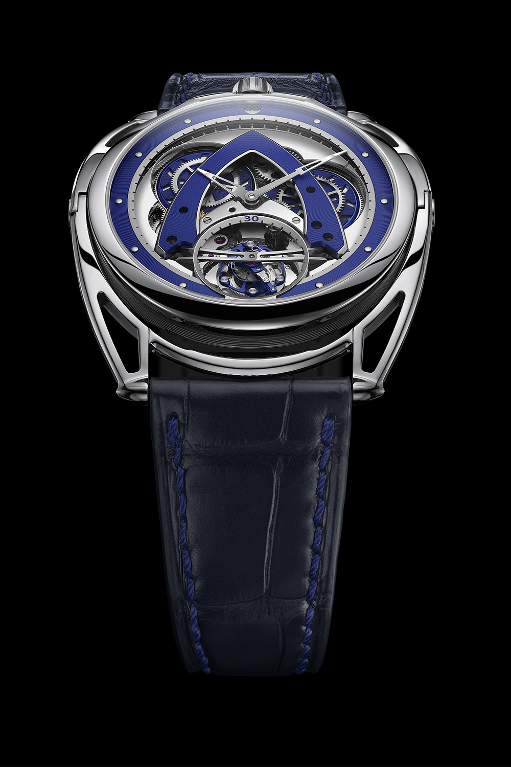 The De Bethune DB28XP Steel Wheels Tourbillon, with a choice of alligator leather strap or textile blue strap, is a limited edition of 10 pieces. It retails for USD 210,000. More information at debethune.ch.