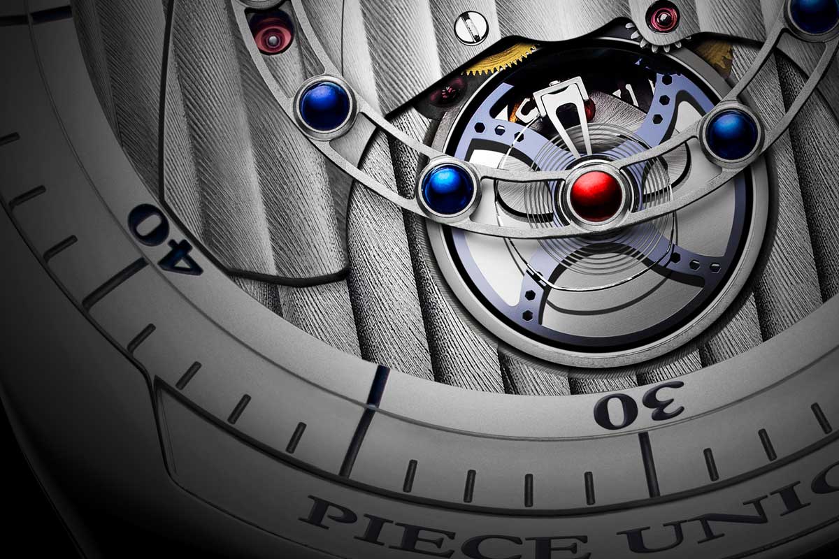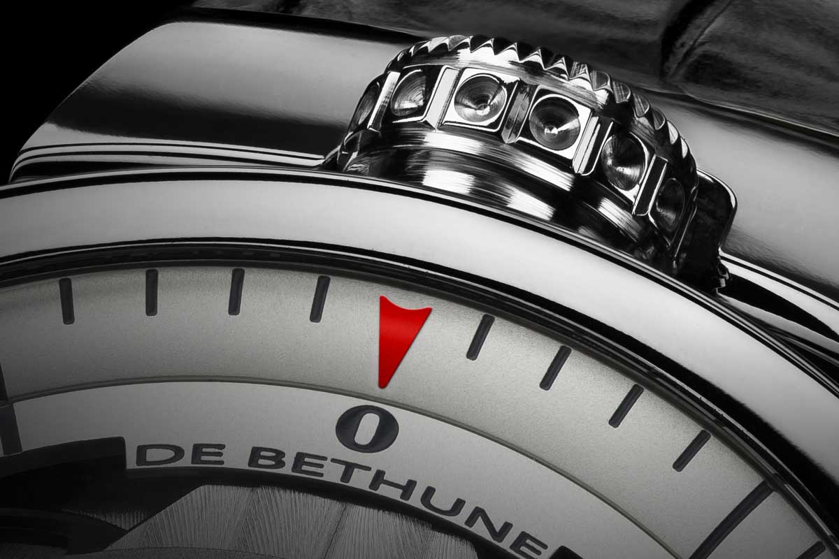 The bright blue hand-polished, and flame blued, steel hands reach exactly to the minute index and hour indices. Unique for the DBS ref. 2005-2015 are the red jewel indicators at 12 and 6 o’clock. Now you know why we think that the De Bethune DBS ref. 2005-2015 is arguably the most special of all 43 Only Watch unique pieces.