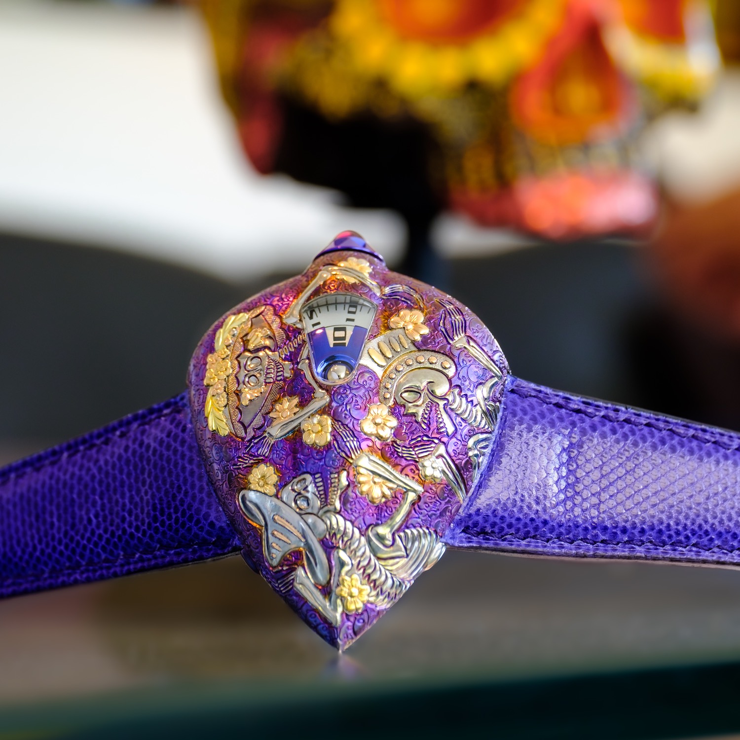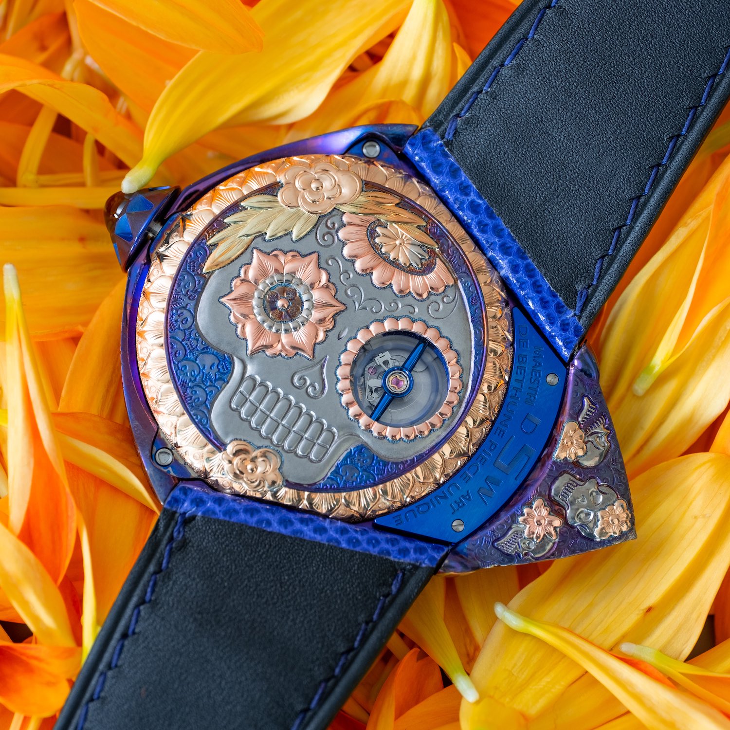 To masterfully reproduce this Día de los Muertos imagery on this wrist-sized sculpture, De Bethune commissioned the talents of one of the top artist/engravers in Switzerland, Michele Rothen, working in concert with Denis Flageollet, master watchmaker and founder of De Bethune. The technical challenge was not only working with a titanium case, but also of having it flame-blued, hand-engraved, and decorated with delicate gold inserts. And to take the level of difficulty a few notches higher still, several different types of 18k gold alloy are used. Metal colour experimentation is characteristic of Denis Flageollet’s work, and in this instance, white gold, yellow gold, rose gold, green gold and marbled gold (a blend of white gold, rose gold and yellow gold) are combined.