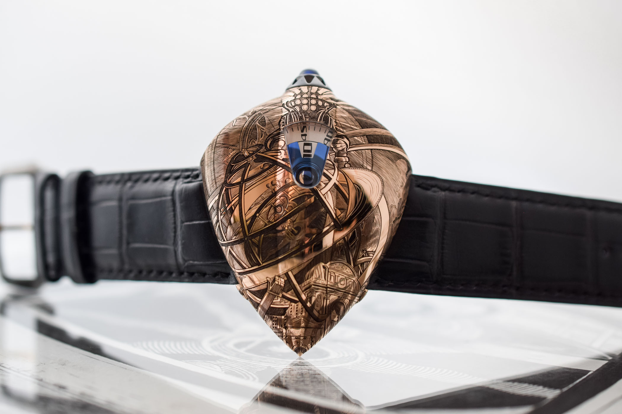 Passionate about the Obscure Cities, Denis Flageollet has reproduced Armilia, a submerged underground city from this comic book masterpiece, on the case of a unique piece DW5. The retro-futuristic curves of the watch, therefore, create a captivating reflection of Armilia’s imaginary world. To masterfully reproduce the sharp lines of Schuiten‘s drawing on this wrist-sized sculpture, De Bethune has solicited the talents of Michele Rothen, one of the top artist-engravers in Switzerland.