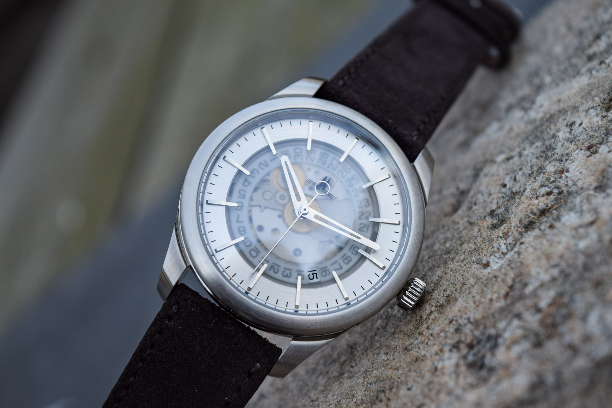 Moving from case to dial, this is where the Oostpoort yet again offers quite a lot for your money. The dial is a three-part construction, loosely inspired by vintage watches like a Universal Geneva Polerouter. The dial has a circular brushed silver outer ring and black minute markers to start with. That hour ring is also fitted with applied, polished hour markers. A nice touch is that part of these hour markers float over the inner part of the dial and thus create depth in the dial. That inner dial is done in matte grey for our review watch but can also be ordered with a sunray brushed blue dial, hinting at Delft Blue pottery. A third option is the Oostpoort Transparent Date which has a blasted, transparent inner dial showing part of the movement underneath. This is the only version that is fitted with a date window at 04:30 o’clock. Centrally mounted, polished steel hands indicate the hours, minutes and seconds. Again though has been put into the proportions, and as a result, the hour hand hits the middle of the hour markers.