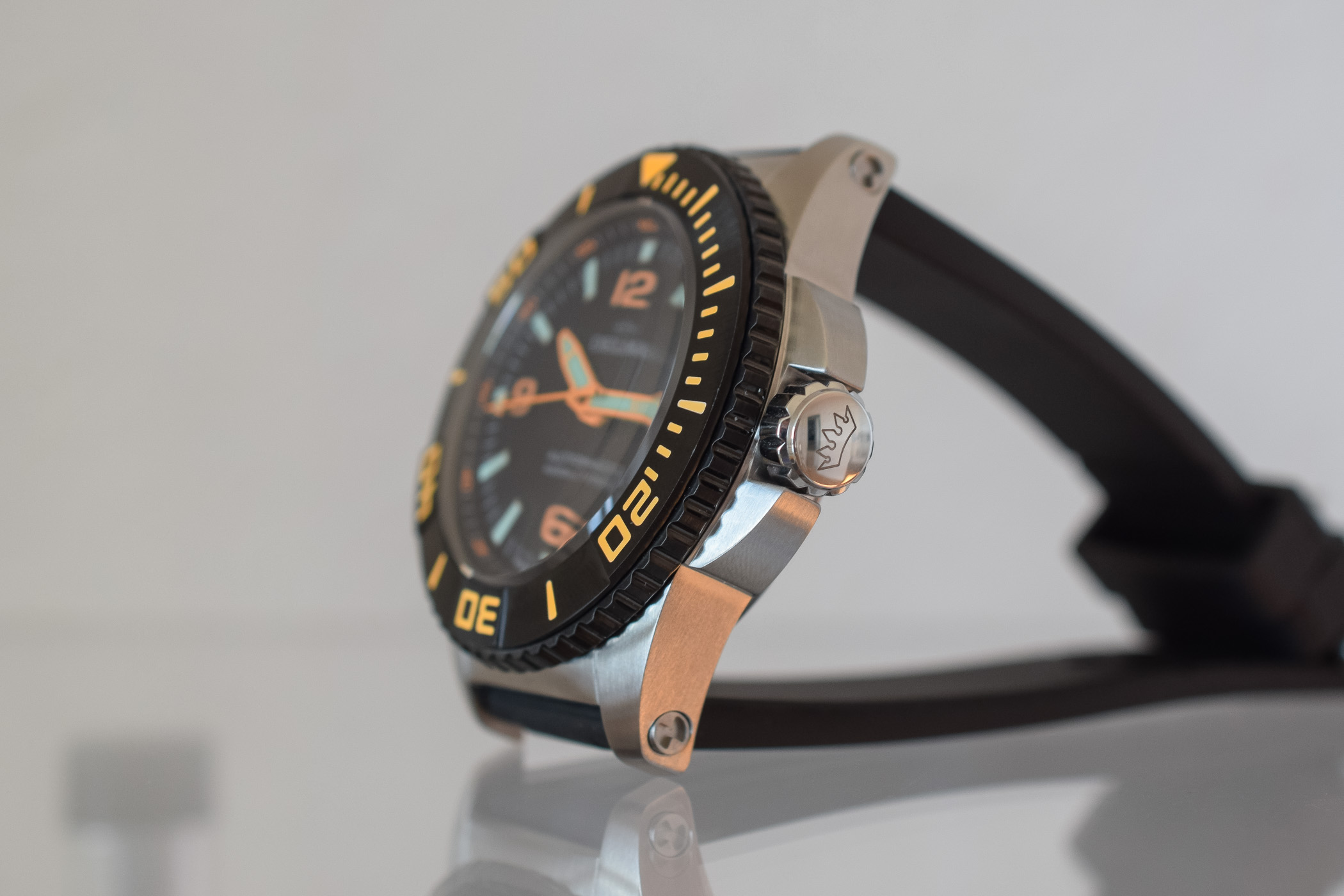 A monster of the abyss, the massive 47mm steel case of the Delma Blue Shark III is now built to fathom depths of 4,000 metres/12,120 feet and was tested and certified by the Swiss PST Laboratory for Product Safety Testing in Zwillikon, Canton of Zurich. But this is not the only modification to Delma’s deep diver. The case design has also been slightly adapted with a new crown guard and new security screws. The PVD steel bezel used for some versions of the Blue Shark 3000m has been replaced with a more resistant DLC-coated steel bezel. Paired with highly legible numerals, indexes and hands, the dial comes in black, blue or orange. The abundant use of luminous material allows for easy and accurate timekeeping in all conditions.