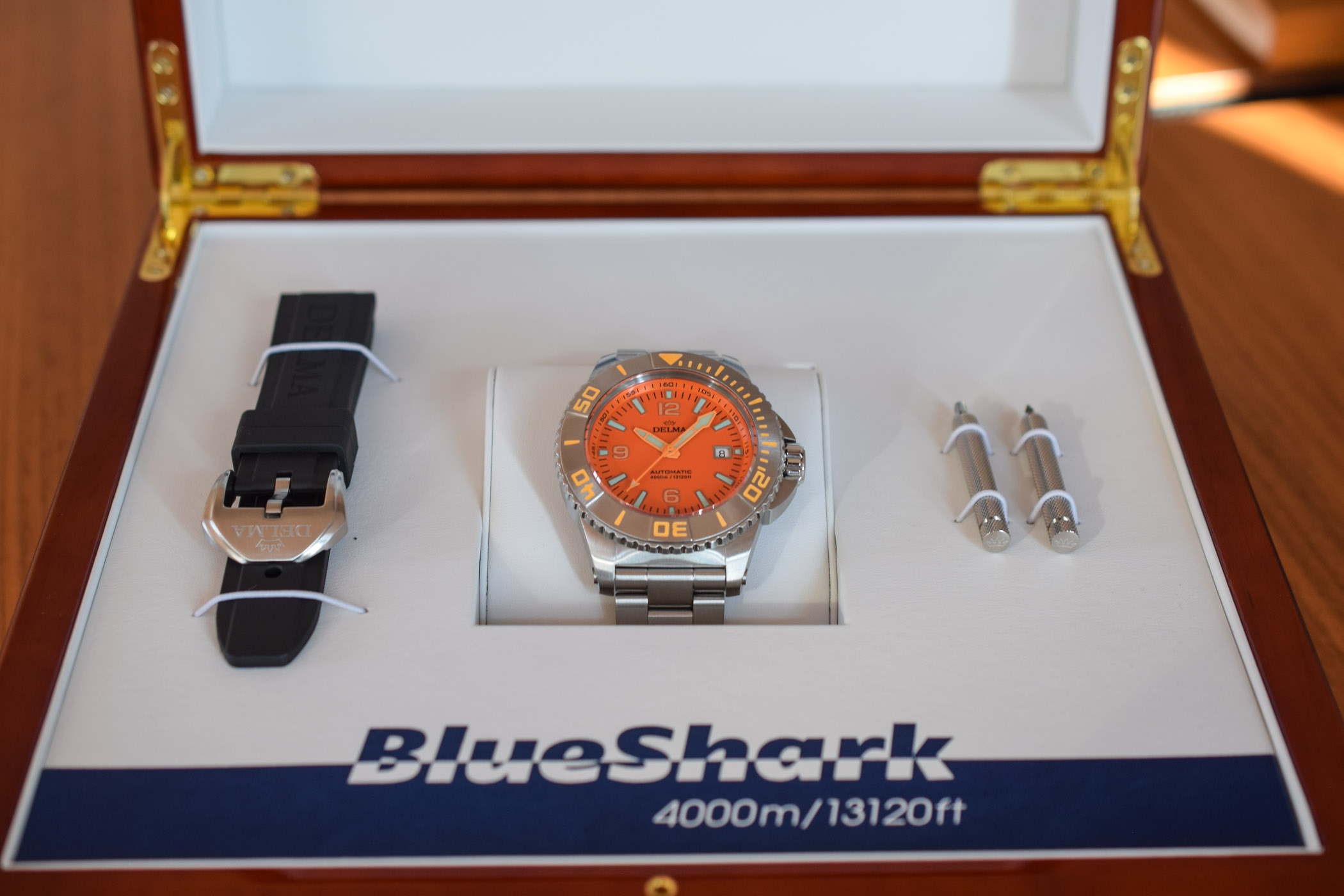 The Delma Blue Shark III is delivered with both a rubber strap (now embossed with the Delma name) and a steel bracelet. The tools included in its wooden box allow you to swap the straps.
