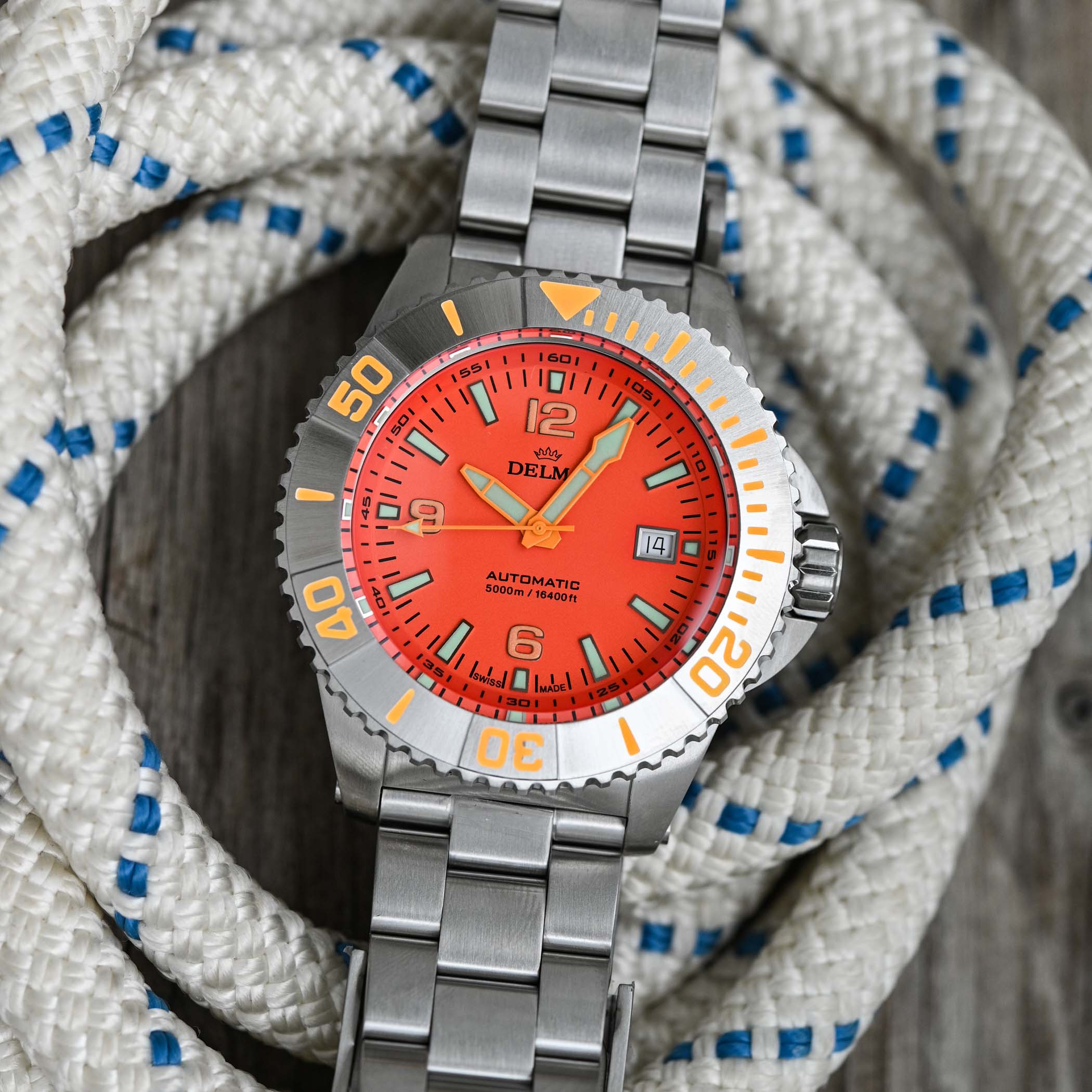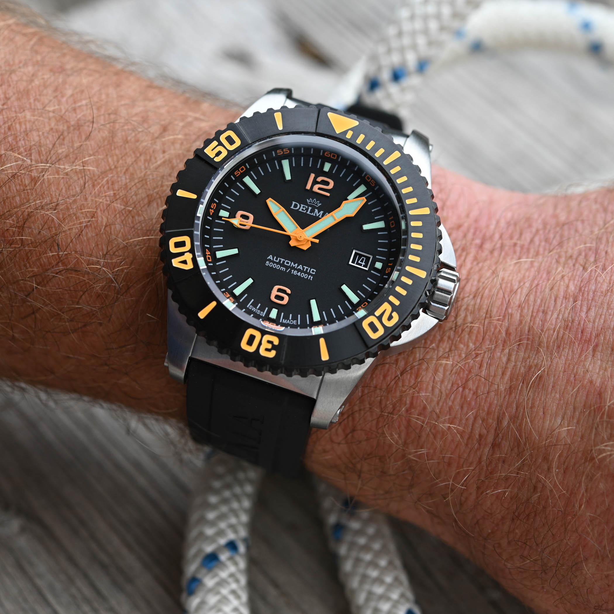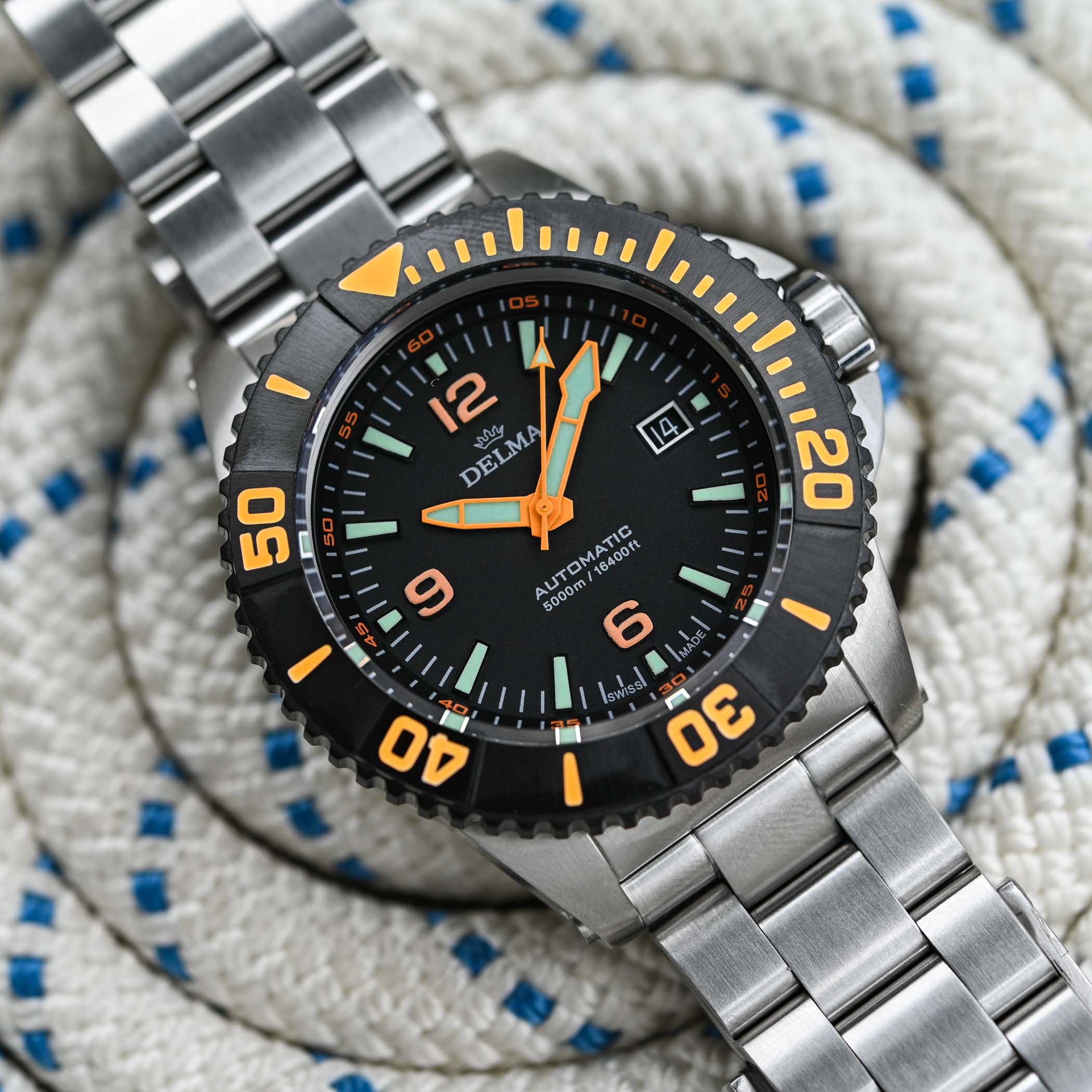 At 47mm in diameter and 20mm thick, the watch packs all the impressive water-resistance into a bulky, weighty container. This isn’t a leisure-style aquatic watch; it is, by all means, a genuine tool for deep waters. The case boasts well-defined surfaces and features a large crown on one side and an automatic helium escape valve on the other. The unidirectional bezel properly graduated with a scale in Super-LumiNova, can be brushed or DLC-coated steel, resembling brushed ceramic. It is a testament to Delma’s craftsmanship and is easy to grip and operate. The ratchet is quite loud and has an excellent springy feel, adding to the fun of use.