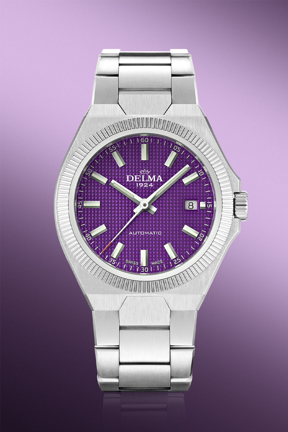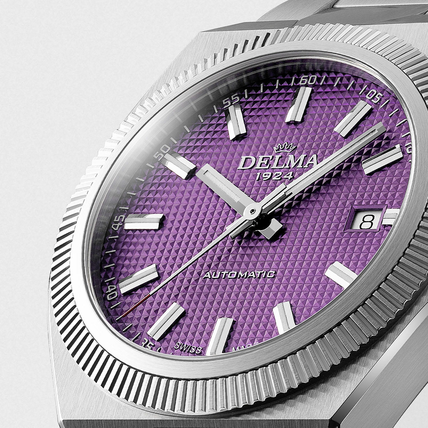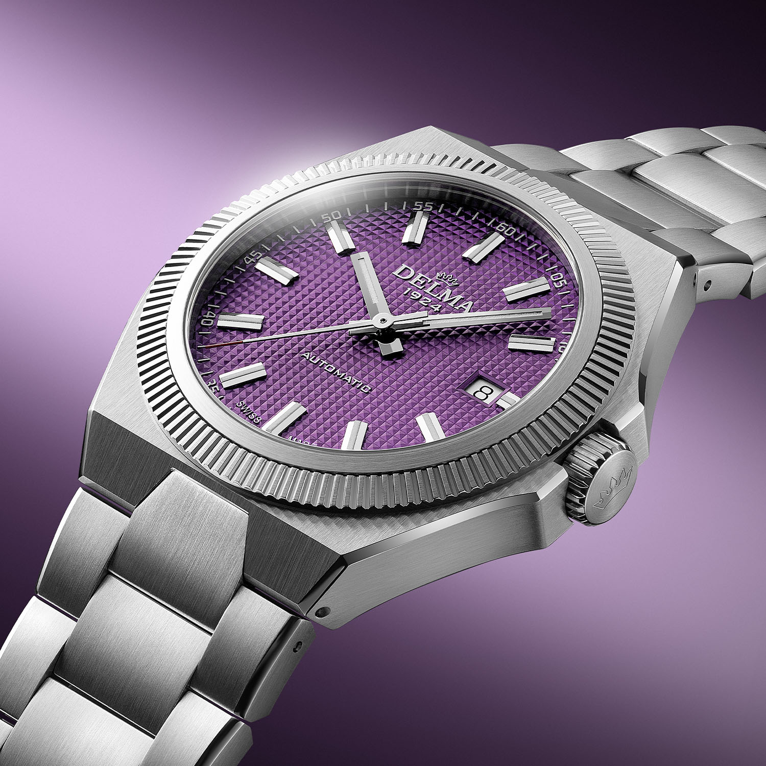 With this new purple dial colour, the Delma Midland Automatic keeps the vibe alive, sitting next to classic colours such as silvery-white, black or dark blue and more striking tones like salmon, green or ice blue. While the purple colour is new to the collection, the rest of the dial remains identical. It features a pyramid-stamped guilloché-style pattern, applied markers and nickel-plated hands filled with Super-LumiNova. A white date window is placed at 3 o’clock.