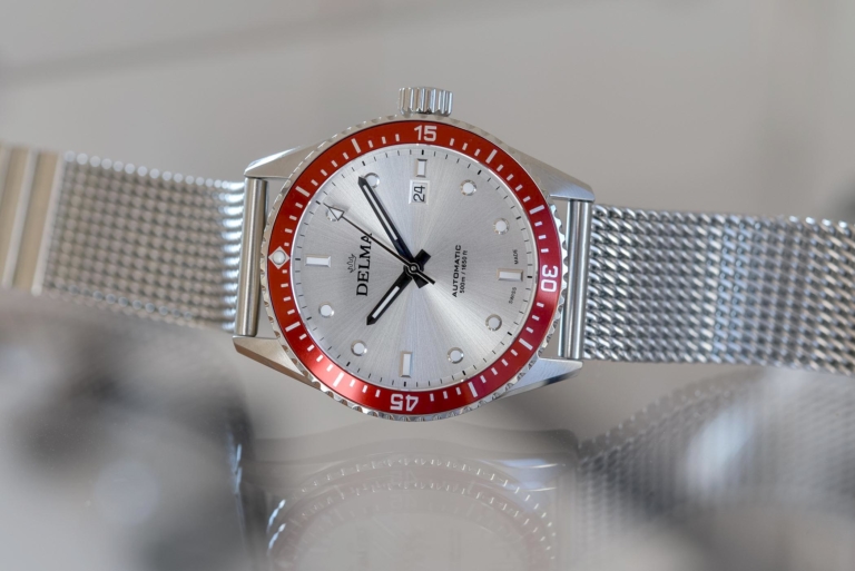 The Delma Oceanmaster Tide is worn on a rubber strap or on a three-link stainless steel bracelet secured with a safety folding buckle. It retails for EUR 1,100 and EUR 1,150 for the automatic versions on a rubber strap and steel bracelet. There are also quartz versions with time-only or chronograph movements. For more information, please visit www.delma.ch.