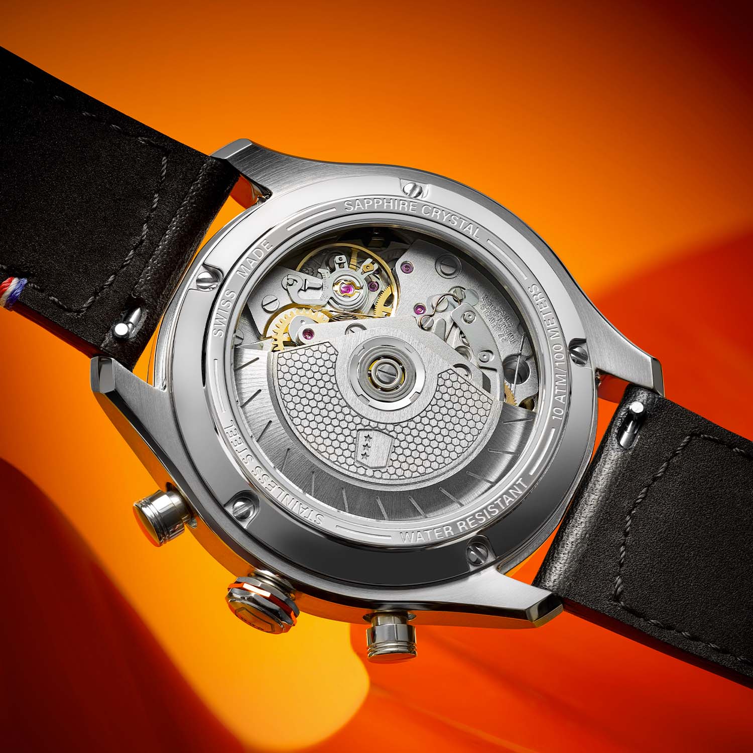 For the Allure Black Tangerine movement, Depancel switches from Sellita to the ETA 7753. This automatic cam-operated chronograph runs at 28,800 vibrations/hour and delivers a 54-hour power reserve. It offers central hours, minutes and chronograph seconds, small seconds, a 30-minute counter, plus a quick-set date. The movement is visible through the transparent caseback, with the decorated oscillating weight.