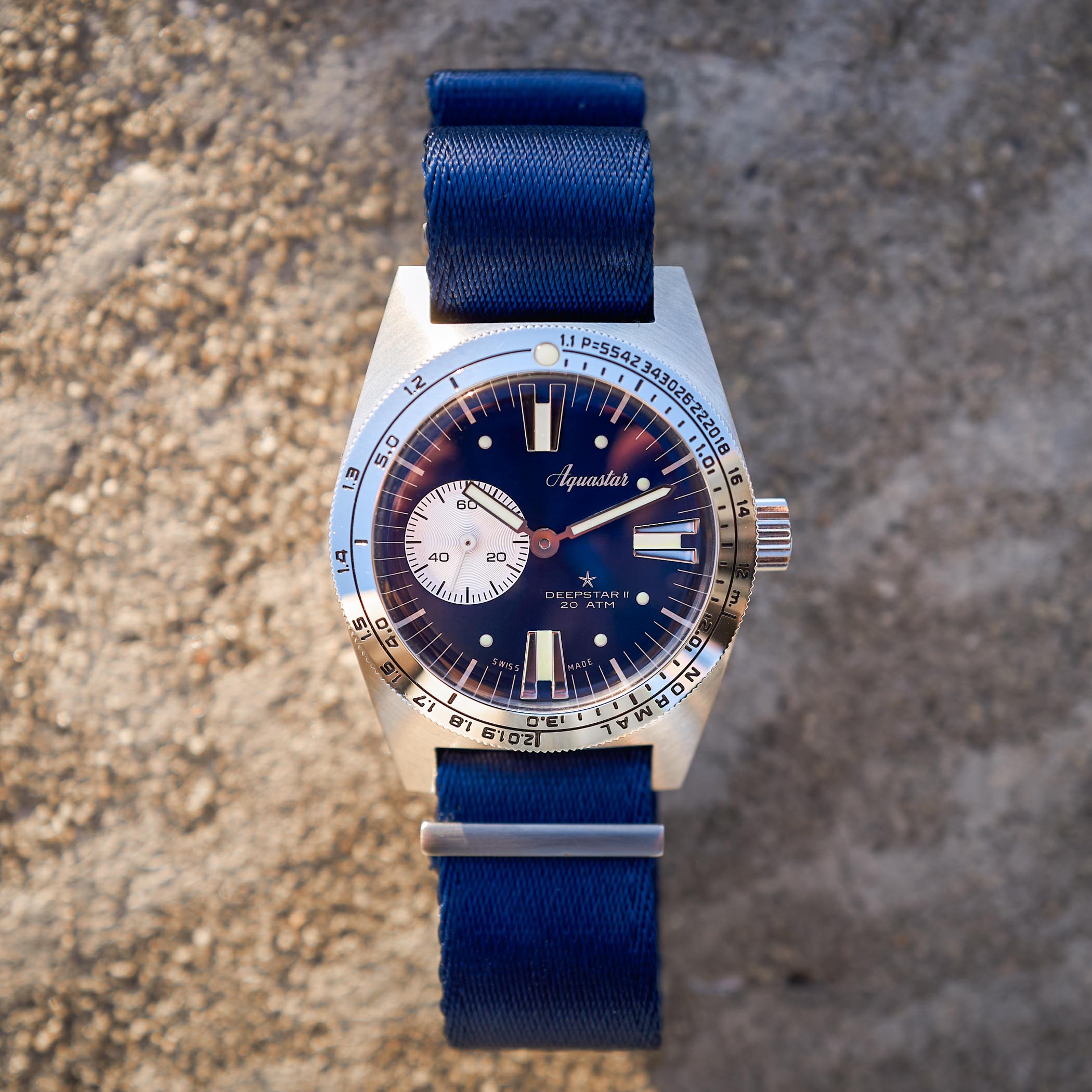 The Aquastar Deepstar II is available in three different dial options; Vintage Black, Blue Ray or Steel Grey. Each colourway will be limited to 300 pieces. It comes equipped with a colour-matched fabric NATO strap. Options for Tropic of ISOFrane rubber straps are also available. It can now be pre-ordered from the brand’s website, at aquastar.ch. The pre-order price is USD 1,490, with a future retail price of USD 1,890.
