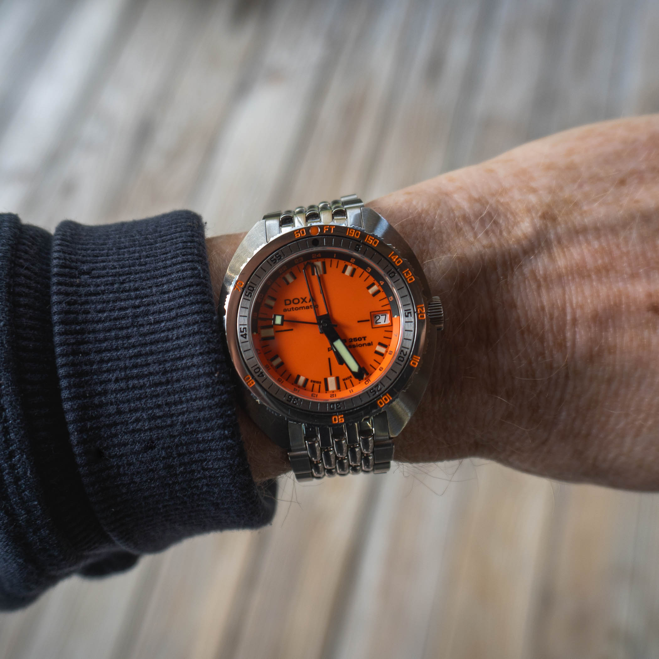 That’s right, Doxa has finally released a GMT dive watch for the very first time since the limited edition 750T GMT way back in 2006. And in a much more user-friendly size than that 45mm behemoth. This newest member of the Doxa family is available in a whole slew of colourways – nine in total. You have the standard Doxa orange, silver, black, yellow, turquoise and navy blue, the more recent white and emerald green additions, and a brand new vintage gradient black. The gradient black is notable for having all-white hands, just like the Doxa Sharkhunters of yore, but paired with vintage-toned lume. I couldn’t see this one in the metal yet (and I’m curious to see it) but instead, I went diving with the all-time classic Professional Orange (what else…) Doxa SUB 250T GMT.
