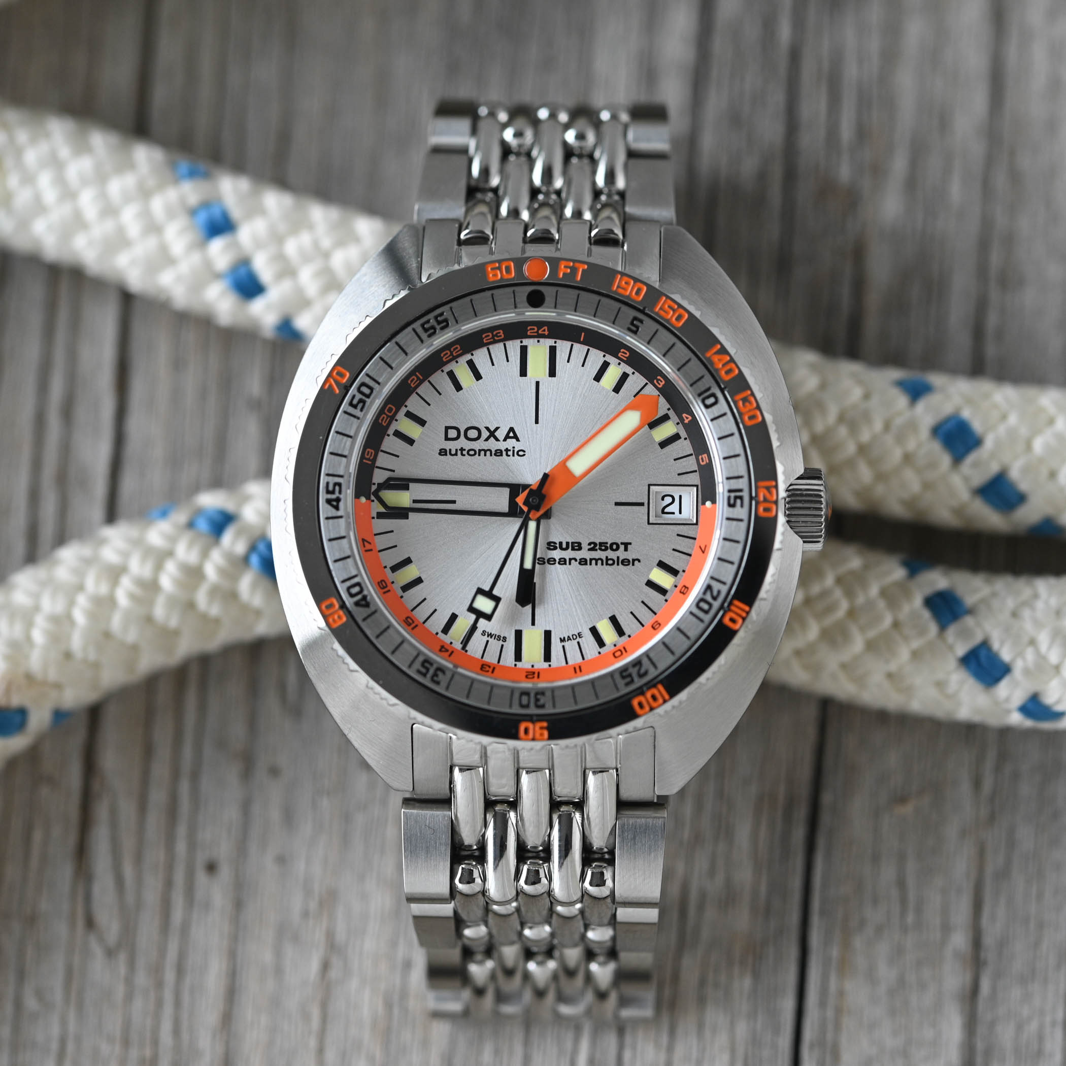 Doxa has been on a real streak these last few years, with new releases what feels like every few months. Since mid-2023 there have been two different Clive Cussler special editions, the whole “Beta” collection, the whole 200T collection, a destro 300T for you southpaws, a whole bunch of new emerald green variants, and a flashy, diamond-encrusted collection. Some have possibly missed the mark (looking at you, diamond encrustments) while some have been certifiable hits (the 200T has been quite popular), but it’s nice to see that a large majority of them lean heavily into, and try to subtly iterate on what is Doxa’s true bread and butter, that unofficial king of vintage divers, the SUB 300. We were lucky enough to take the watch that releases today on a recent dive trip and I am happy to report that it continues that classic approach, and in a way people have been clamoring for for many years. Say hello to the Doxa SUB 250T GMT.