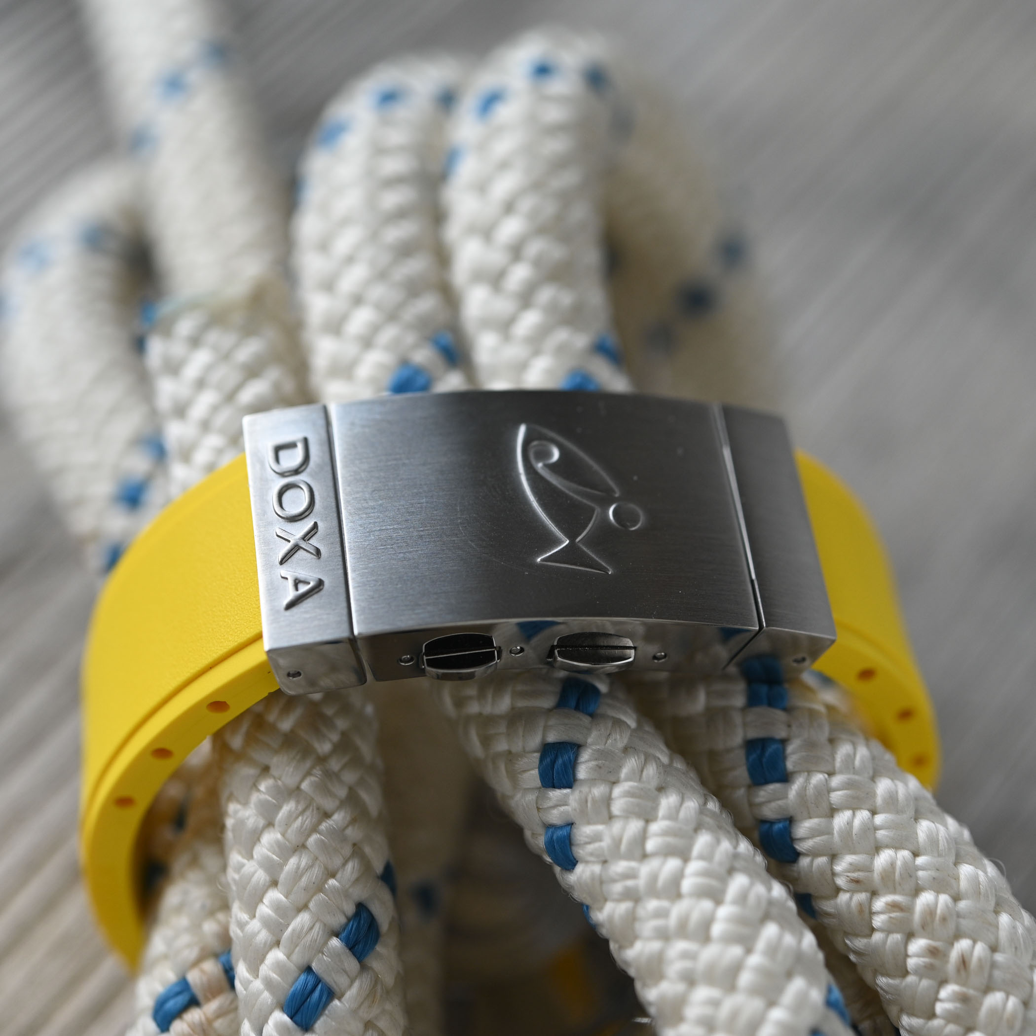 The SUB 250T GMT is available on the iconic Beads-of-Rice bracelet or Doxa’s high-quality FKM rubber strap. Both are excellent and very comfortable. When diving, I had to quickly switch it to a third-party NATO strap as a misjudgement of the water temperatures left it too small for the wetsuit I was wearing; no fault of the bracelet, which has a handy dive extension that should cover all situations, except for this one caused by an overestimation of my body’s cold water tolerances and a rental wetsuit that was just a tad too thick for how I sized the bracelet at home – so you know why there’s a NATO strap involved here…