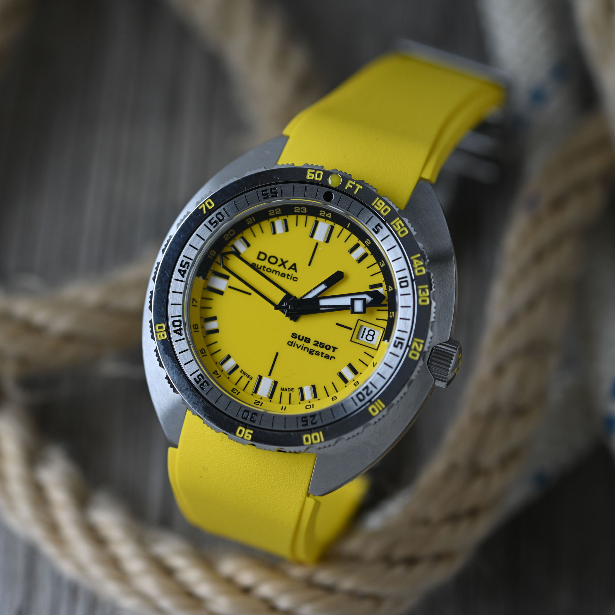It has long been said that Doxa during the 1960s chose the colour orange for their dive watches as it is the last colour of the spectrum that disappears as you descend underwater, thus increasing the watch’s legibility beyond that of other colours. This is technically not true, and actually, the yellow of the Divingstar would stay visible longer and deeper than the orange Professional (red disappears first, followed by orange, yellow, green and blue). I’m not sure how this myth has persisted for so long, but I digress.
