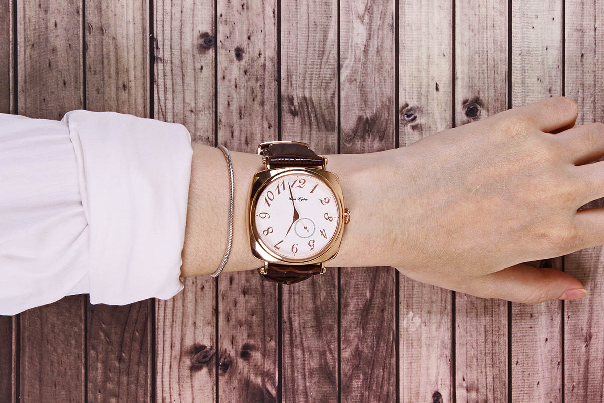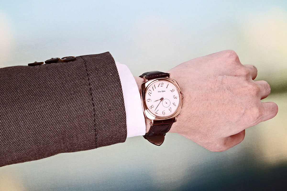 The Don Kylne & Co watch is made of stainless steel (polished or gold plated) and shows a 40.5mm case. The design is clearly reminiscent of vintage military or officer watches, with the cushion-shaped central case and straight, thin lugs with screws to hold the strap – we can see inspirations from the Panerai Radiomir of course and also a bit of the Laurent Ferrier Galet Square and its unique Only Watch 2015 Edition (not the worst inspirations to be frank). Of course, we can’t compare here it in terms of quality – and clearly that’s not the point.