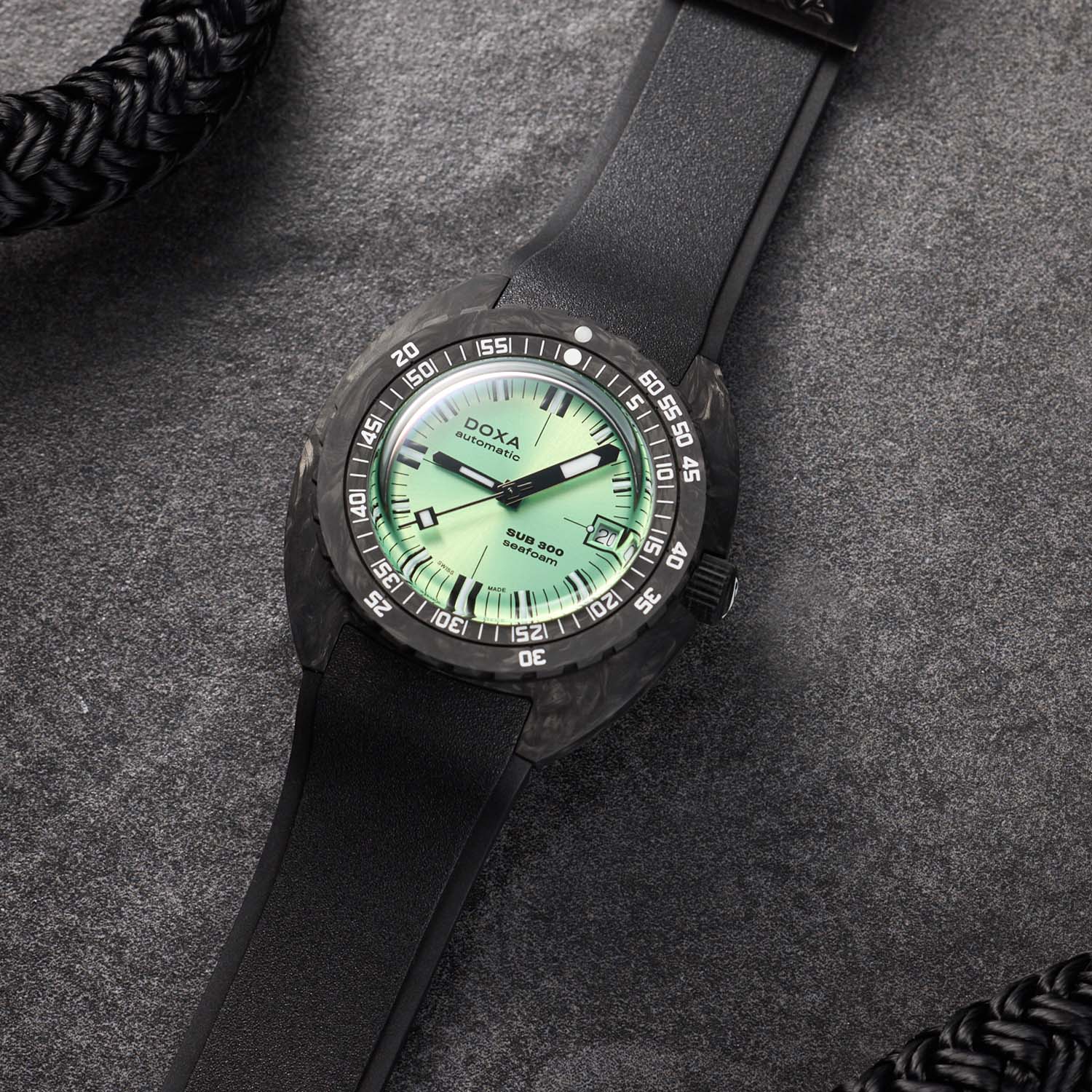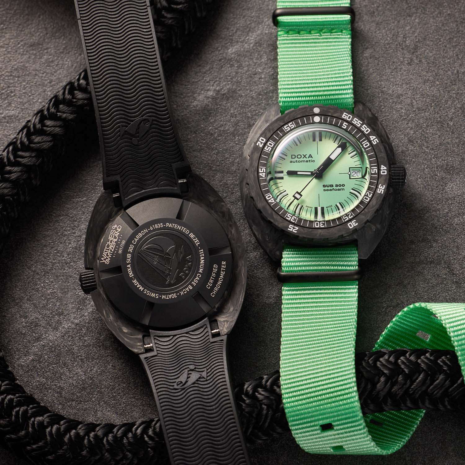 The SUB 300 Carbon Seafoam is delivered with two strap options: a black FKM rubber strap fitted with a black PVD folding clasp and dive extension, and a matching Seafoam NATO strap. The solid titanium caseback bears the Watches of Switzerland logo and the individual edition number. The watch is available from Watches of Switzerland online, or in US and UK boutiques. Price is USD 3,990 or GBP 3,890. For more info, visit watchesofswitzerland.com or doxawatches.com.