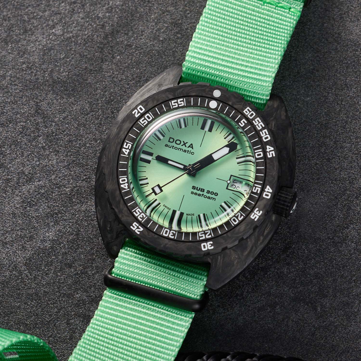 Dial colours are an integral part of Doxa‘s iconic diving story. From the blazing Professional Orange that defined the SUB 300 in the 1960s to today’s rainbow of professional-grade divers, the brand has always known how to pair serious underwater credentials with a playful edge. Now, in collaboration with Watches of Switzerland, Doxa introduces a new colour scheme on its forged carbon diver: the SUB 300 Carbon Seafoam Limited Edition, a run of just 100 numbered pieces.